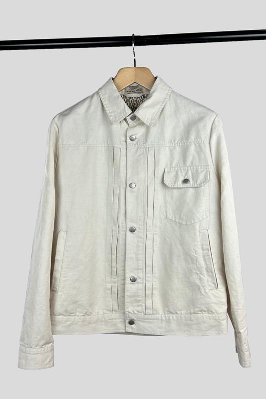 Sobrecamisa en color crudo de lino y algodón, con detalles verticales, un bolsillo frontal y dos laterales.