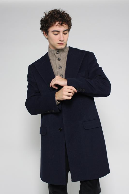 Abrigo azul marino en lana, de corte entallado, con solapas anchas y dos bolsillos laterales.