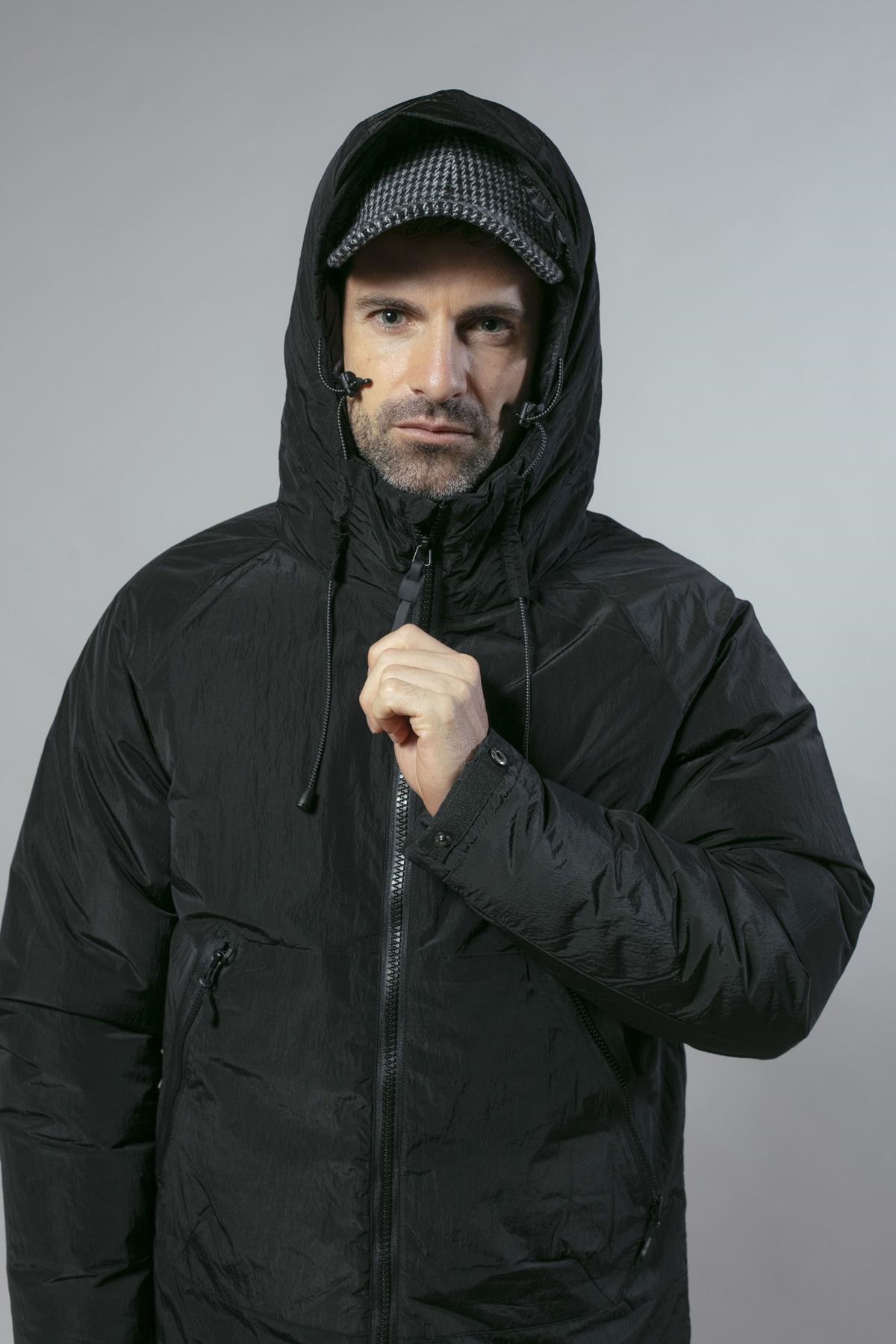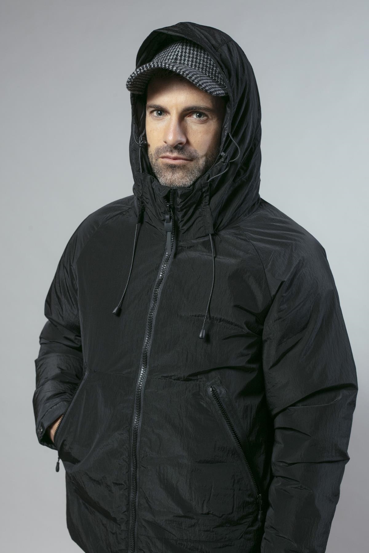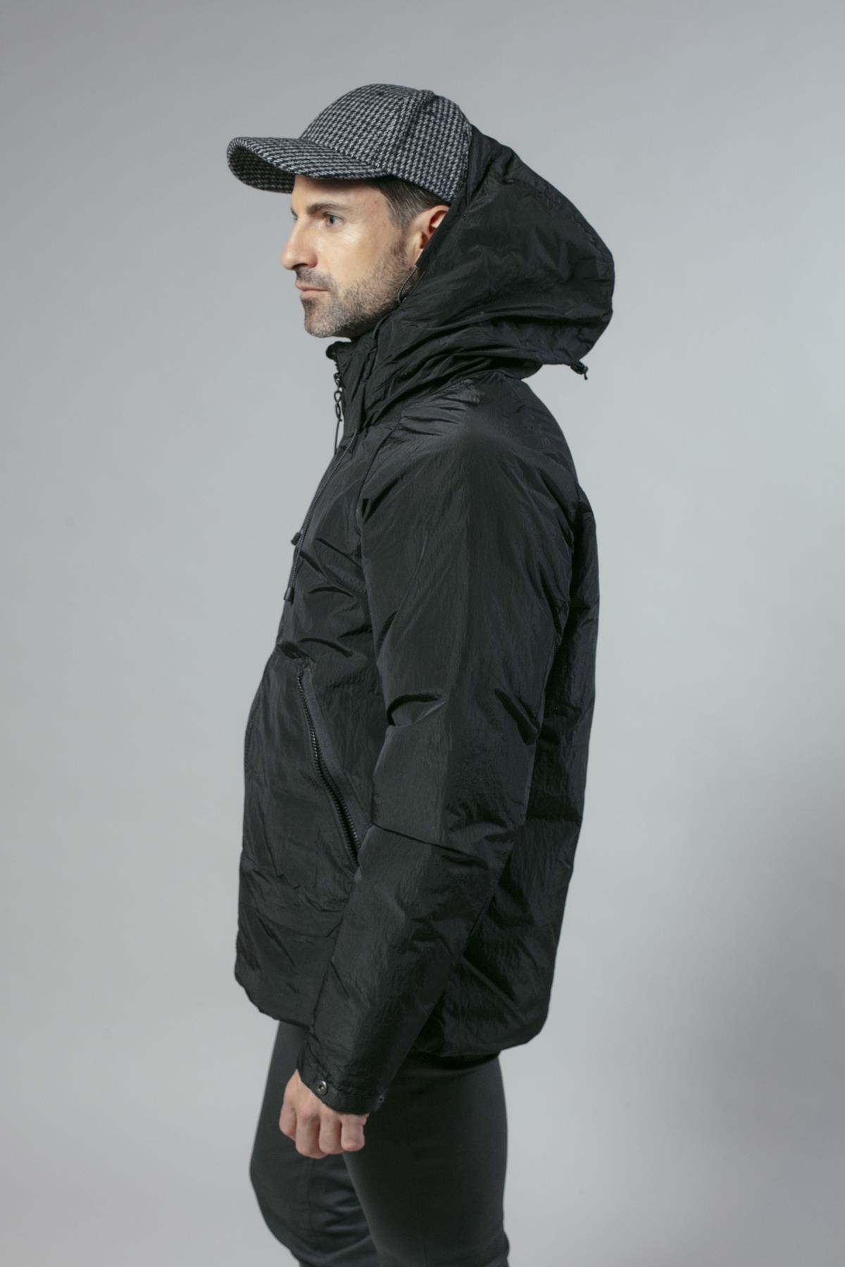 Anorak ligeramente brillante con cierre de cremallera y capucha fija. Tiene dos bolsillos laterales y el bajo es ajustable. Disponible en dos colores: negro y azul marino.