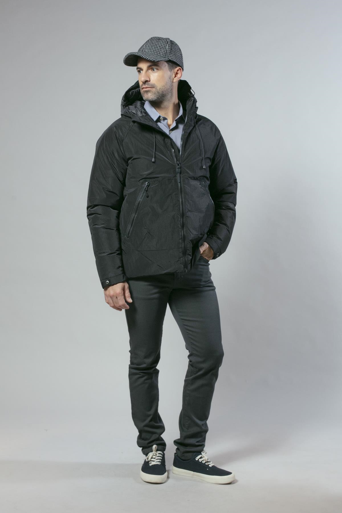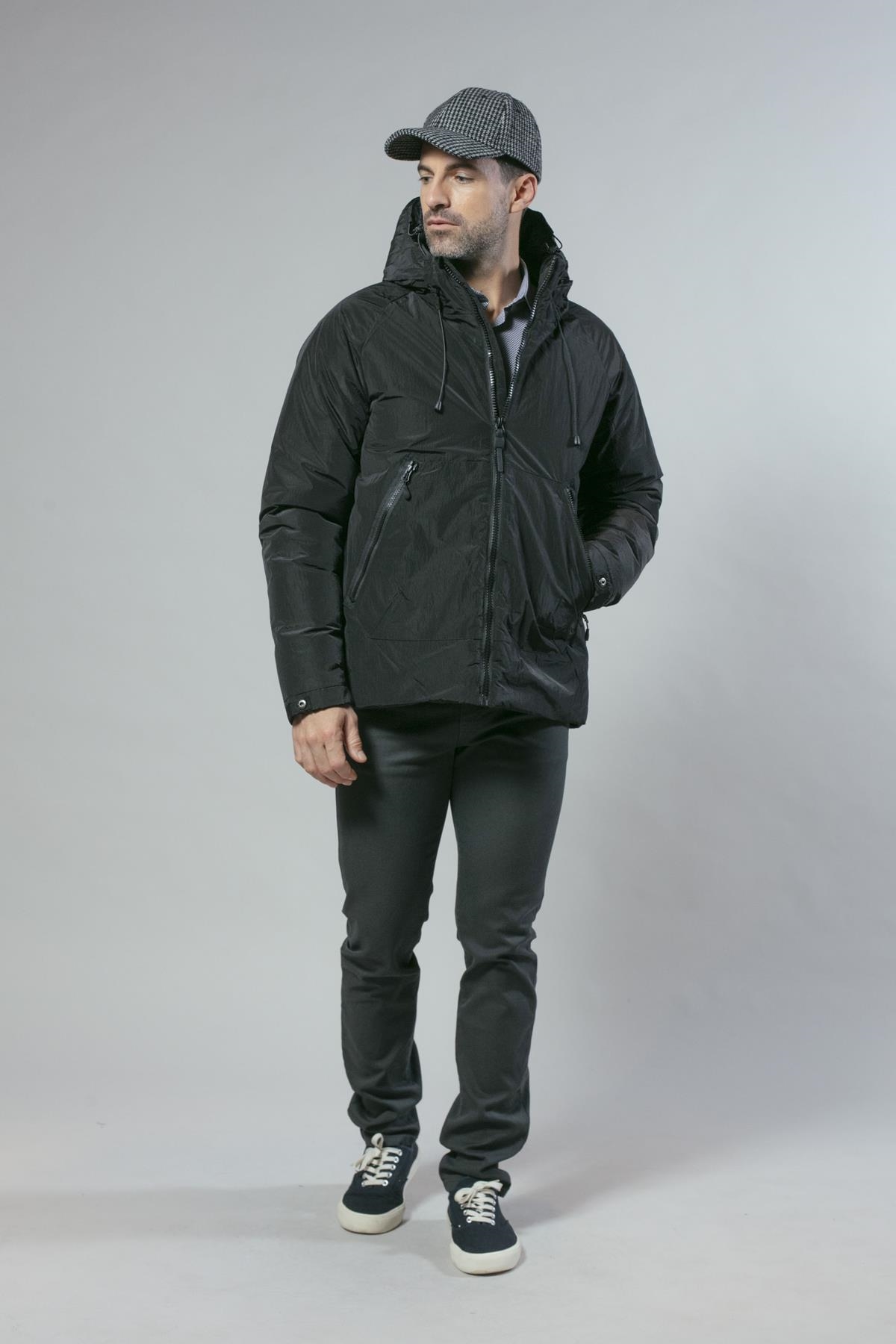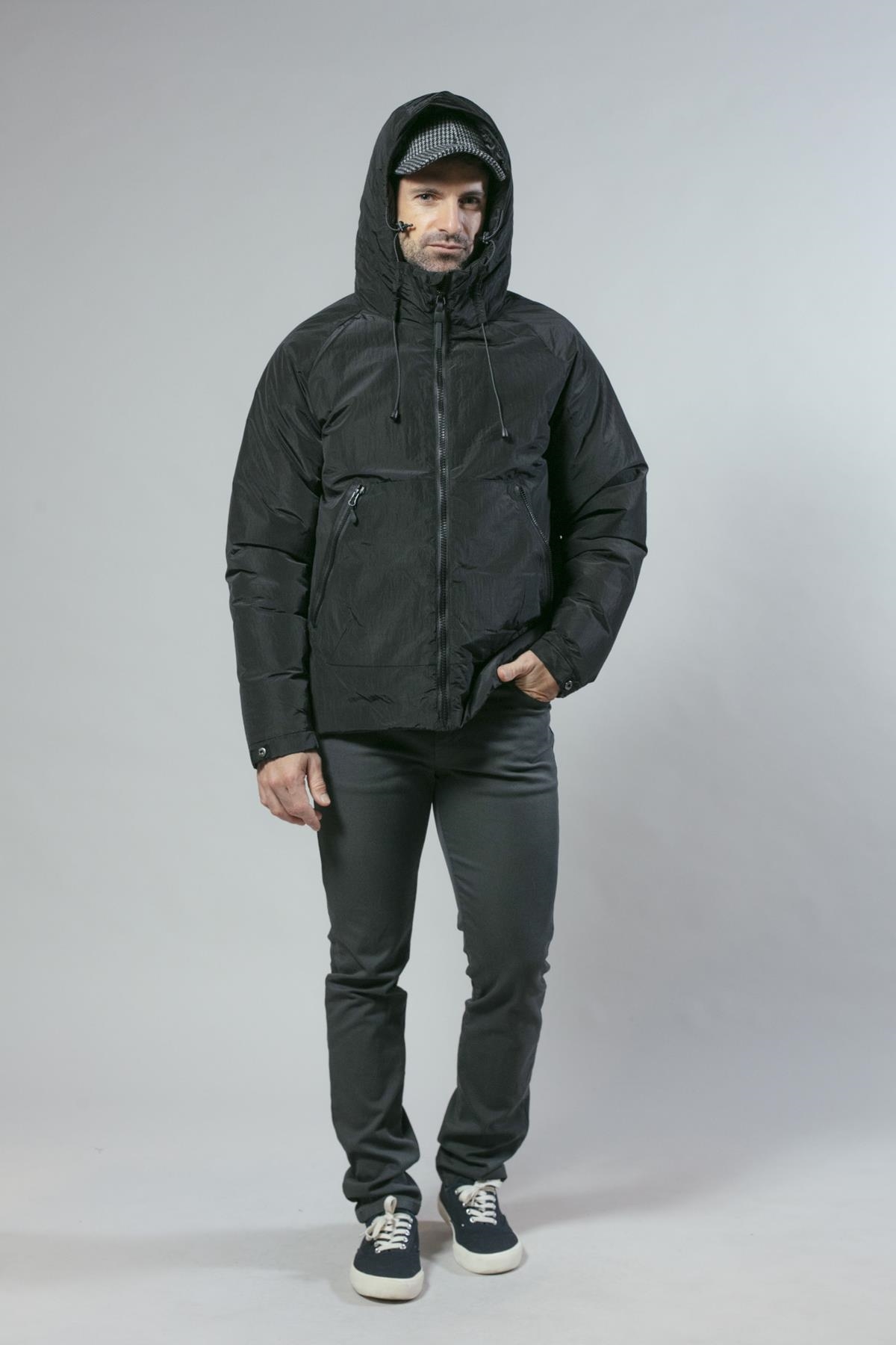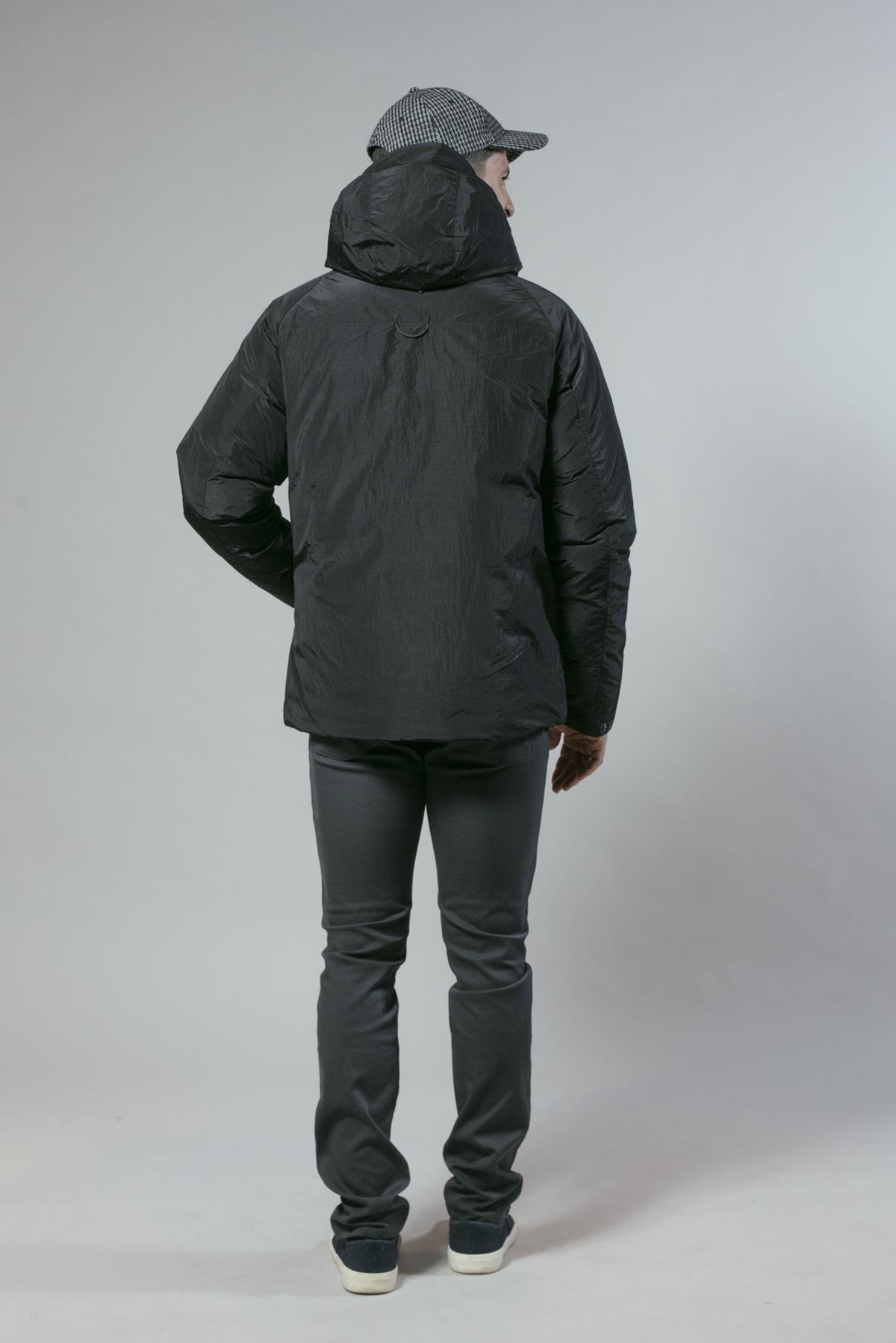 Anorak ligeramente brillante con cierre de cremallera y capucha fija. Tiene dos bolsillos laterales y el bajo es ajustable. Disponible en dos colores: negro y azul marino.