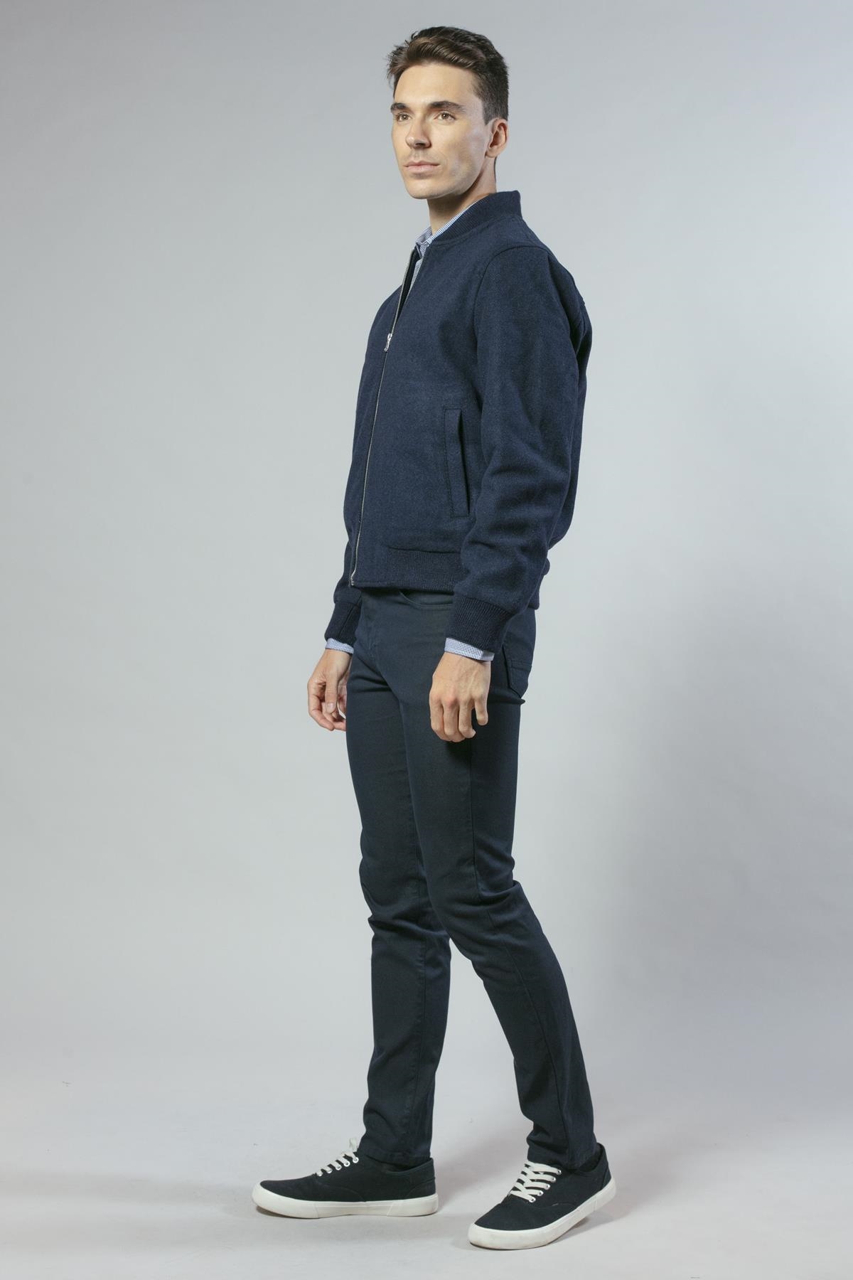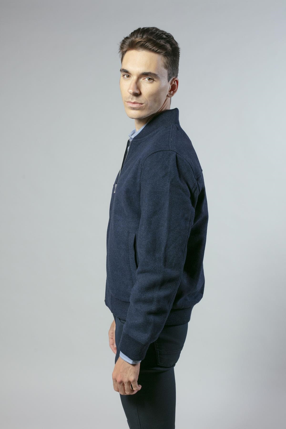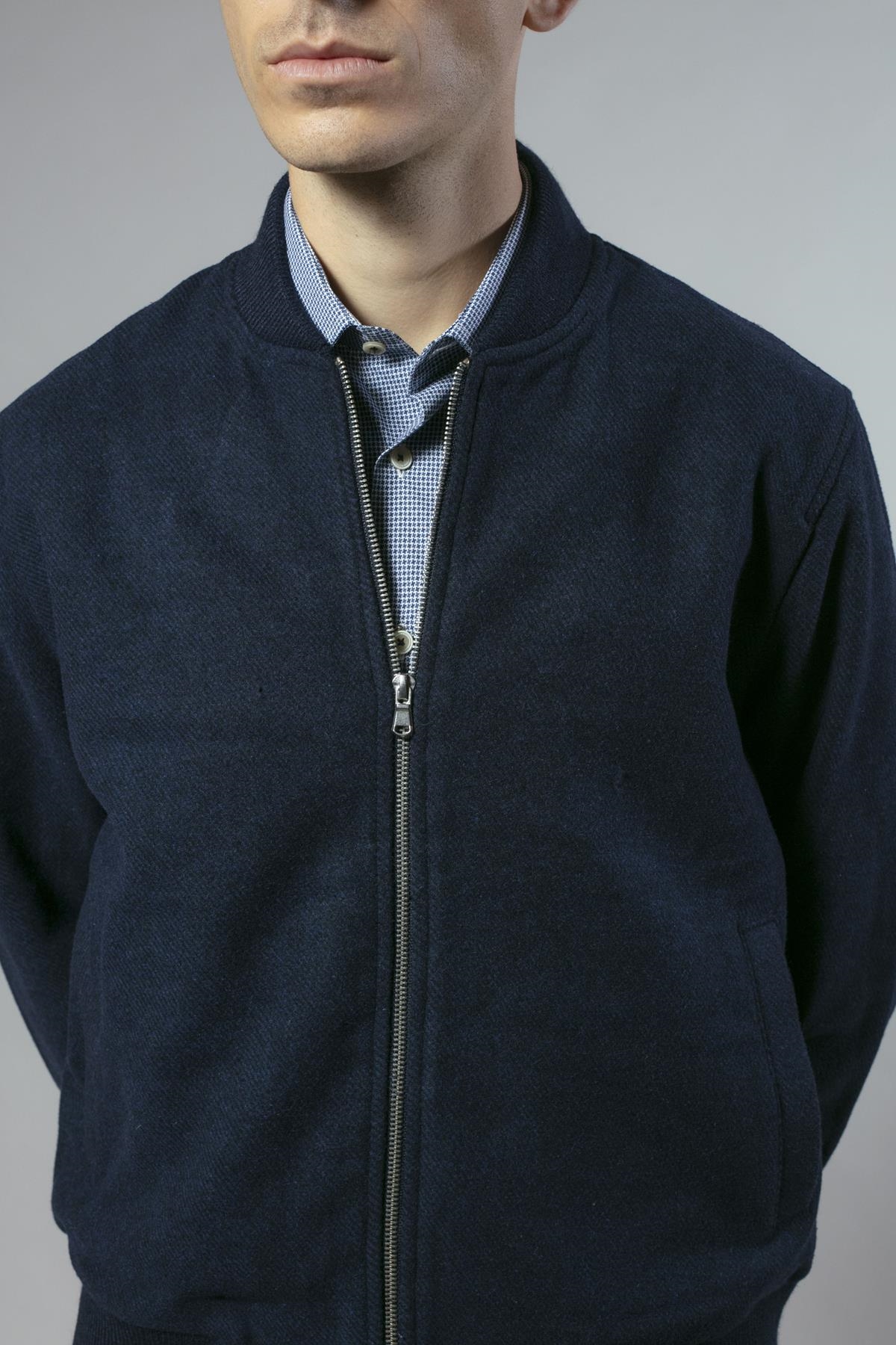 Chaqueta "bomber" azul marino en lana, de corte ligeramente regular y cierre de cremallera. Tiene el cuello, los puños y la parte trasera del bajo en canalé.