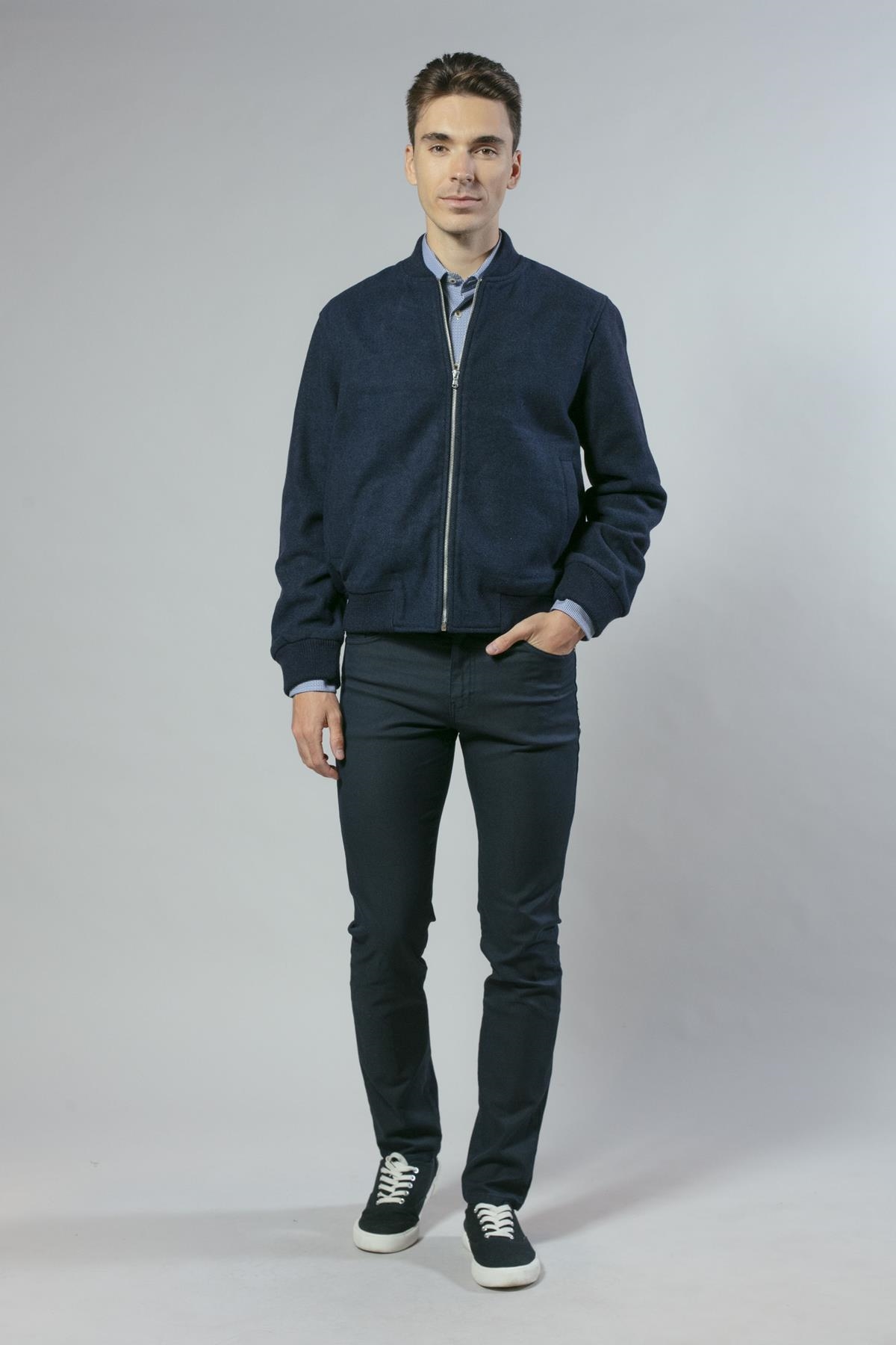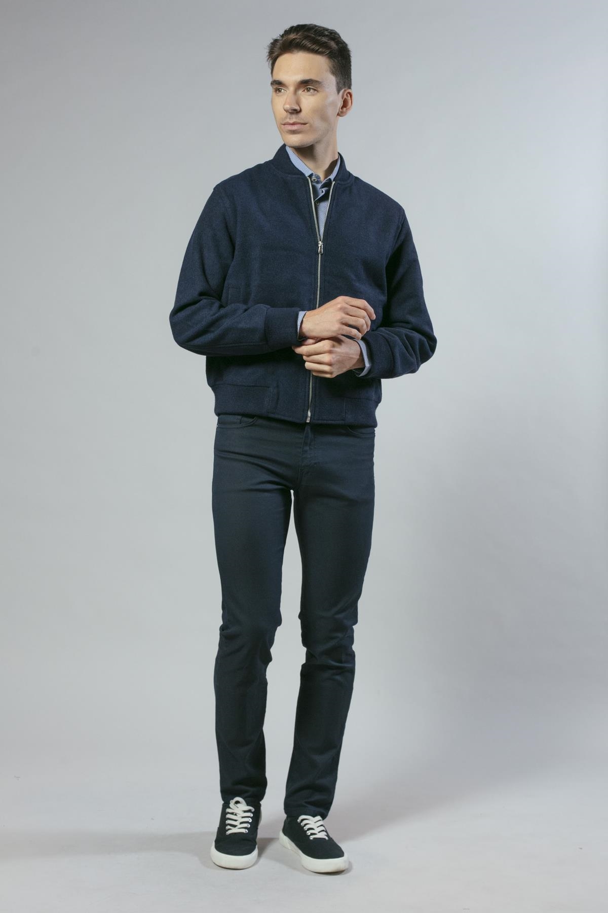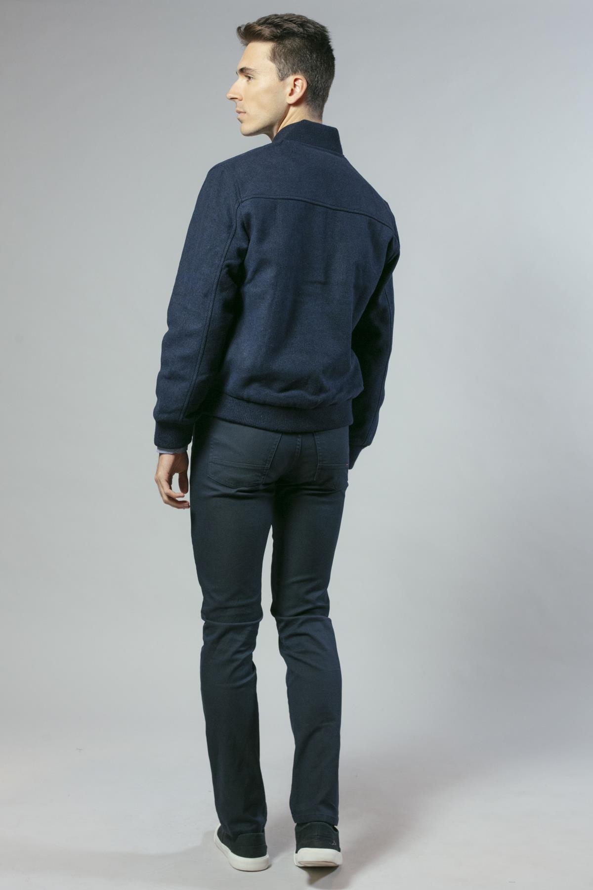 Chaqueta "bomber" azul marino en lana, de corte ligeramente regular y cierre de cremallera. Tiene el cuello, los puños y la parte trasera del bajo en canalé.