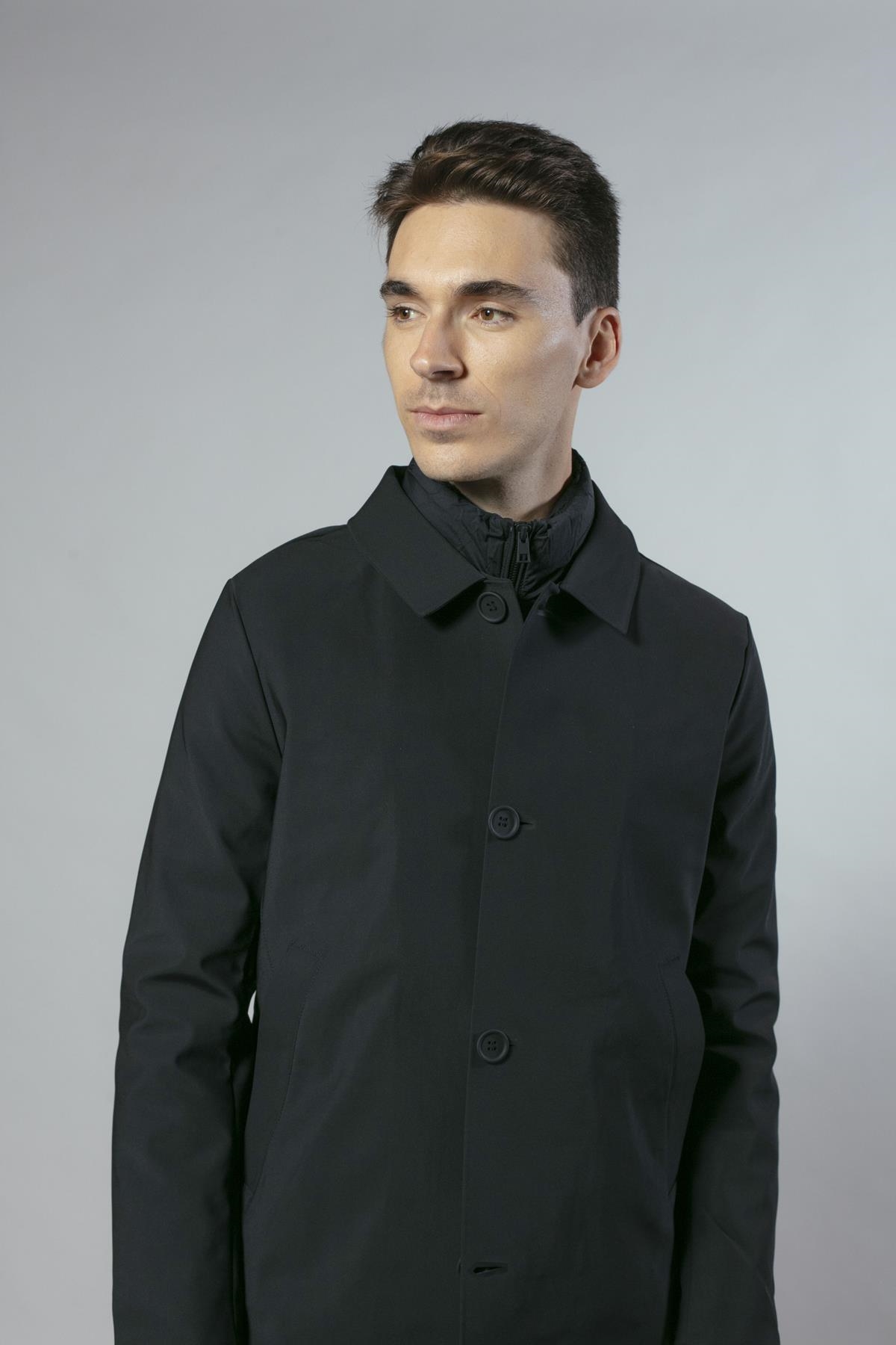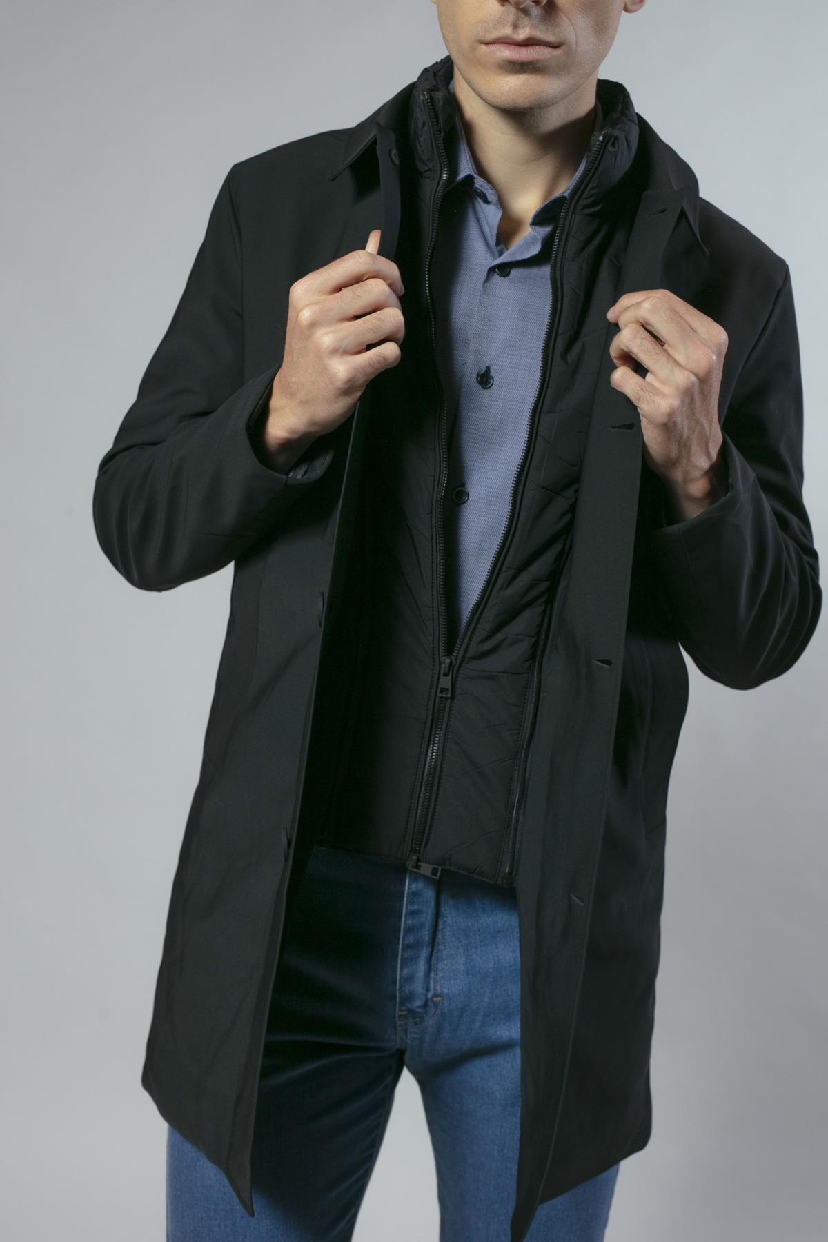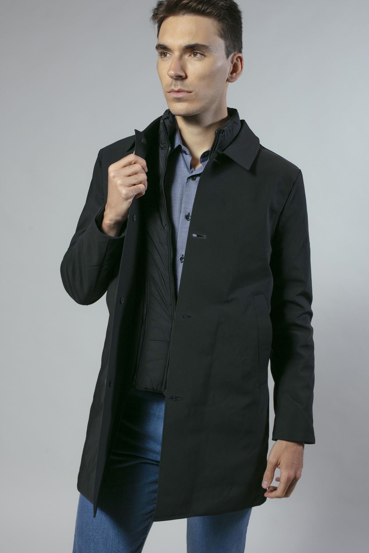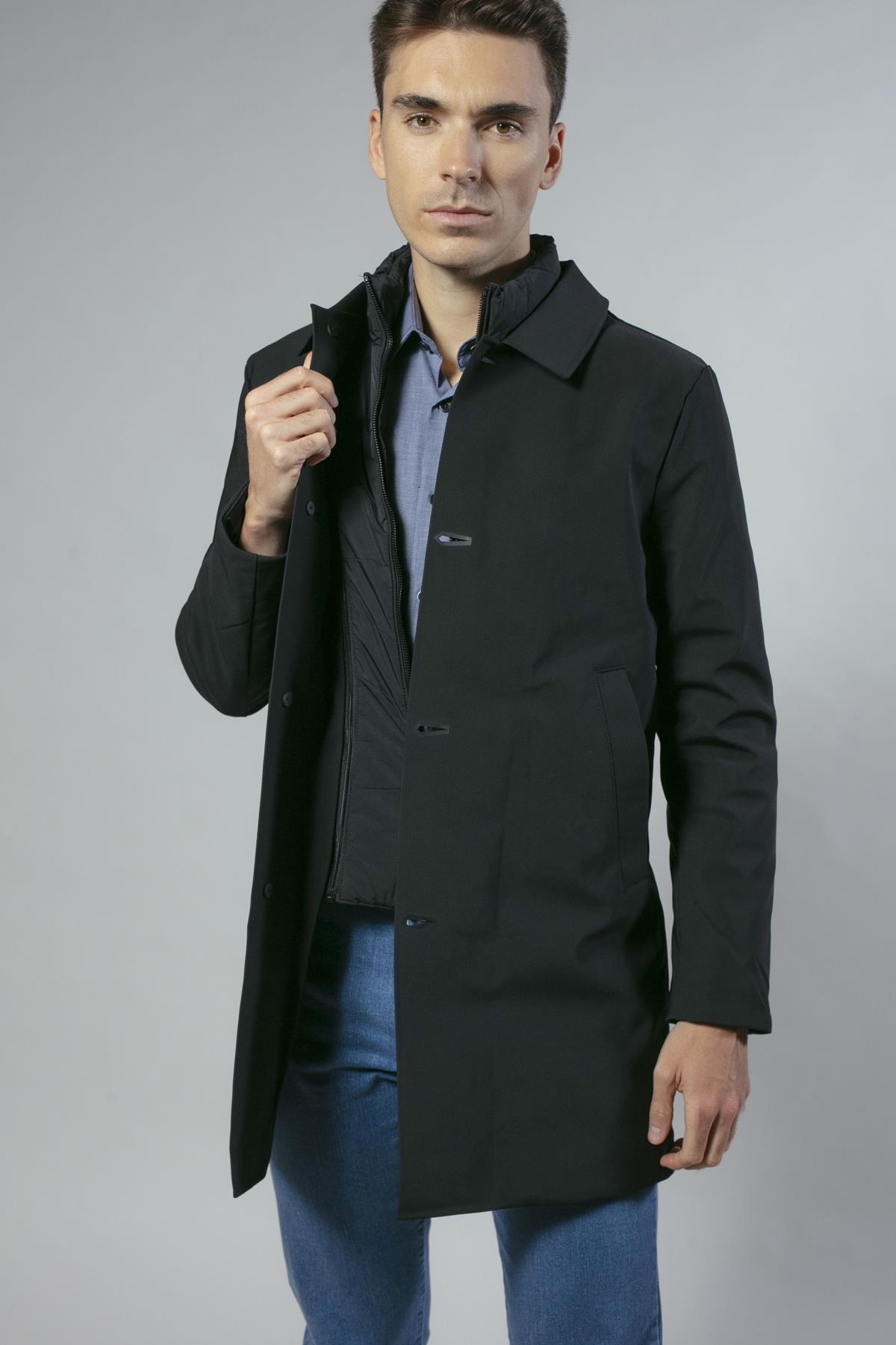 Gabardina en nylon elástico con falso chaleco acolchado extraíble. De corte ligeramente ajustado y bolsillos laterales. Disponible en dos colores: negro y azul marino.