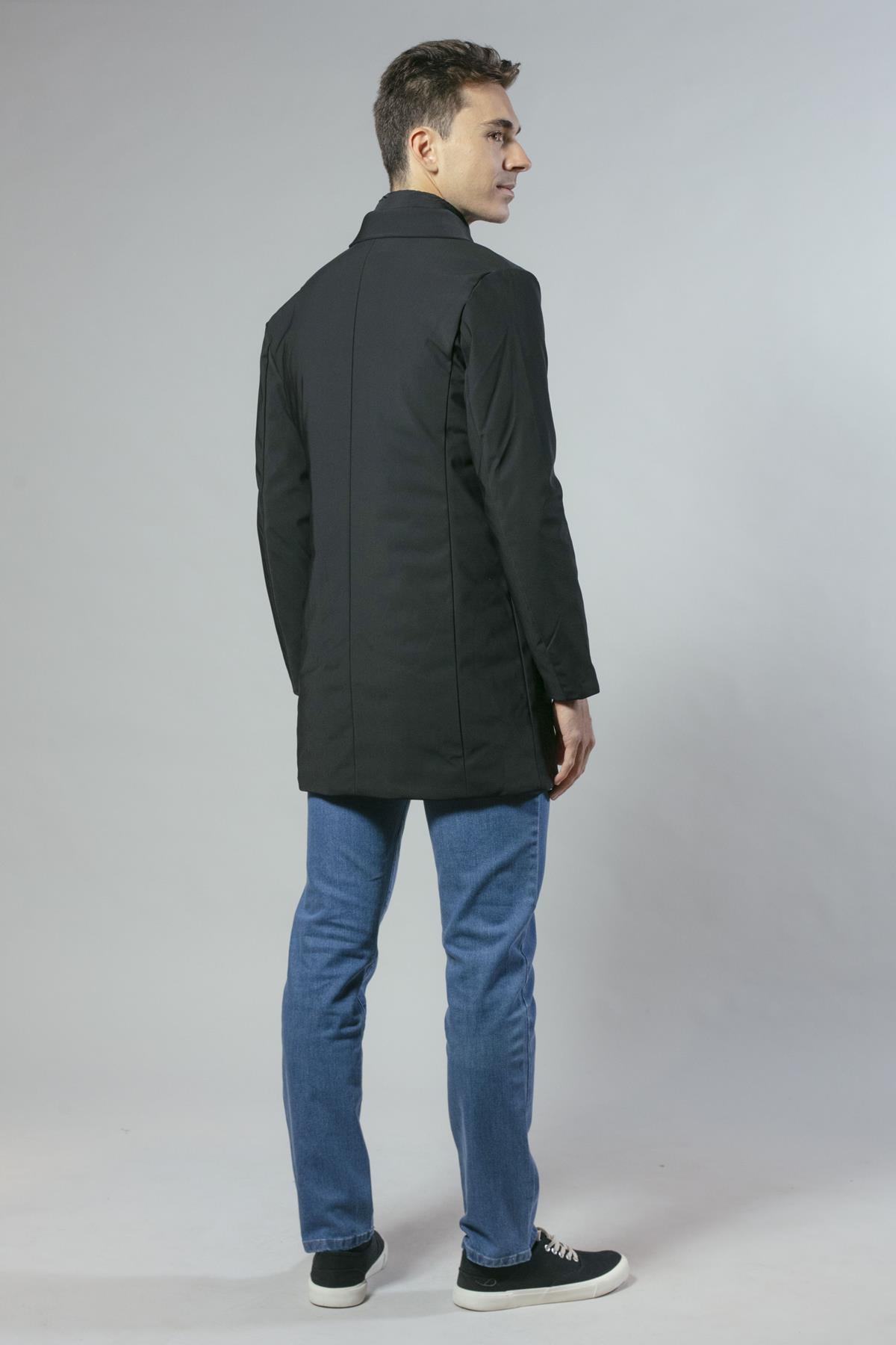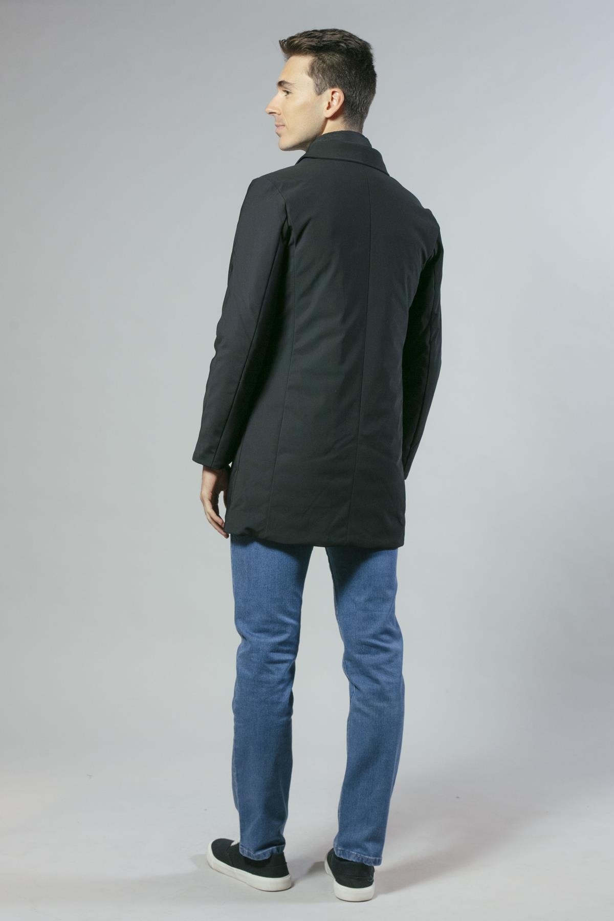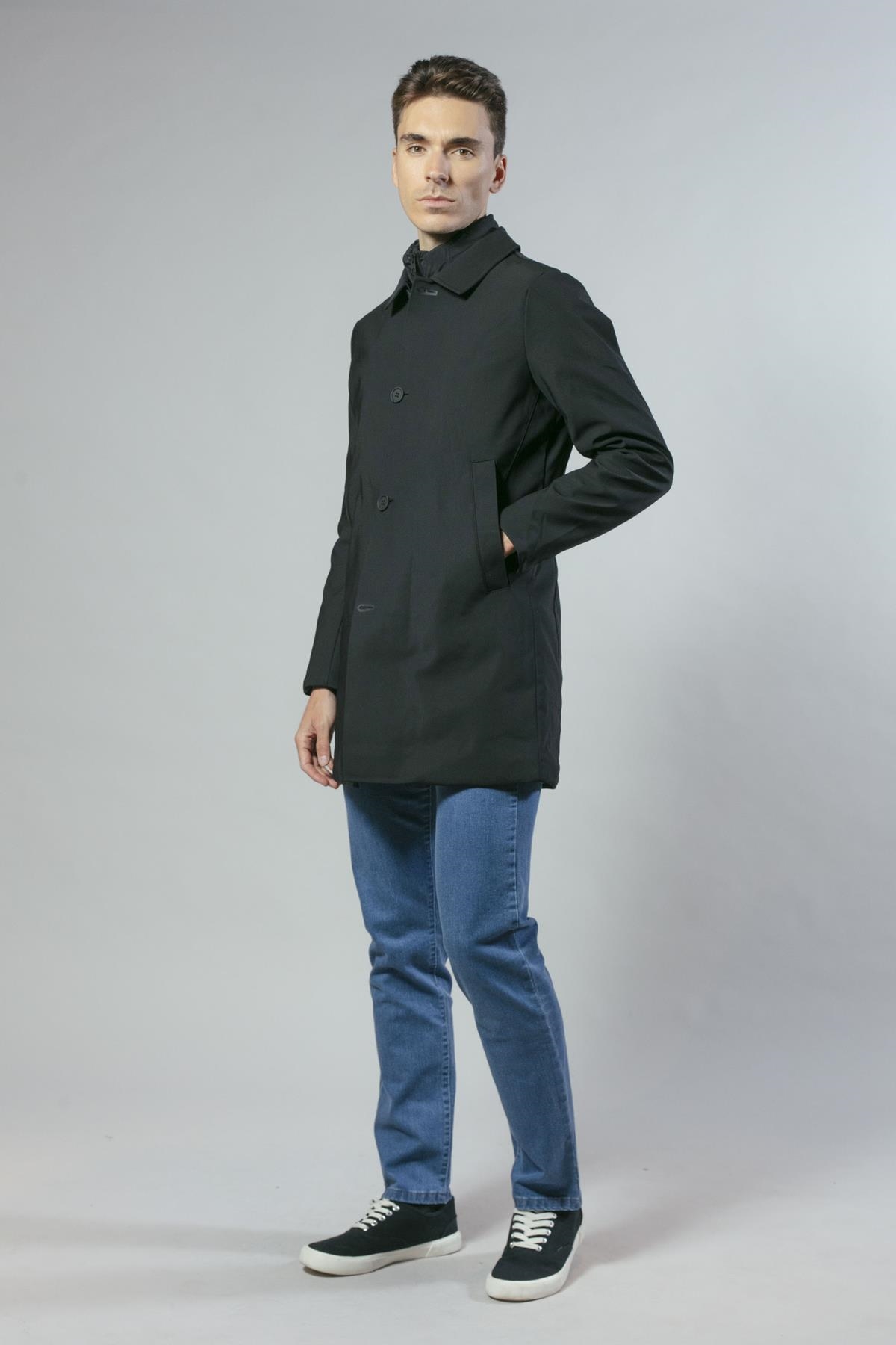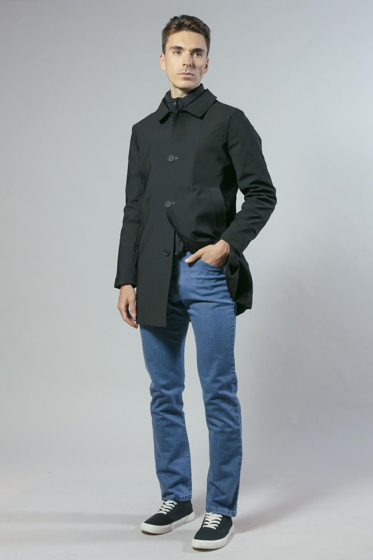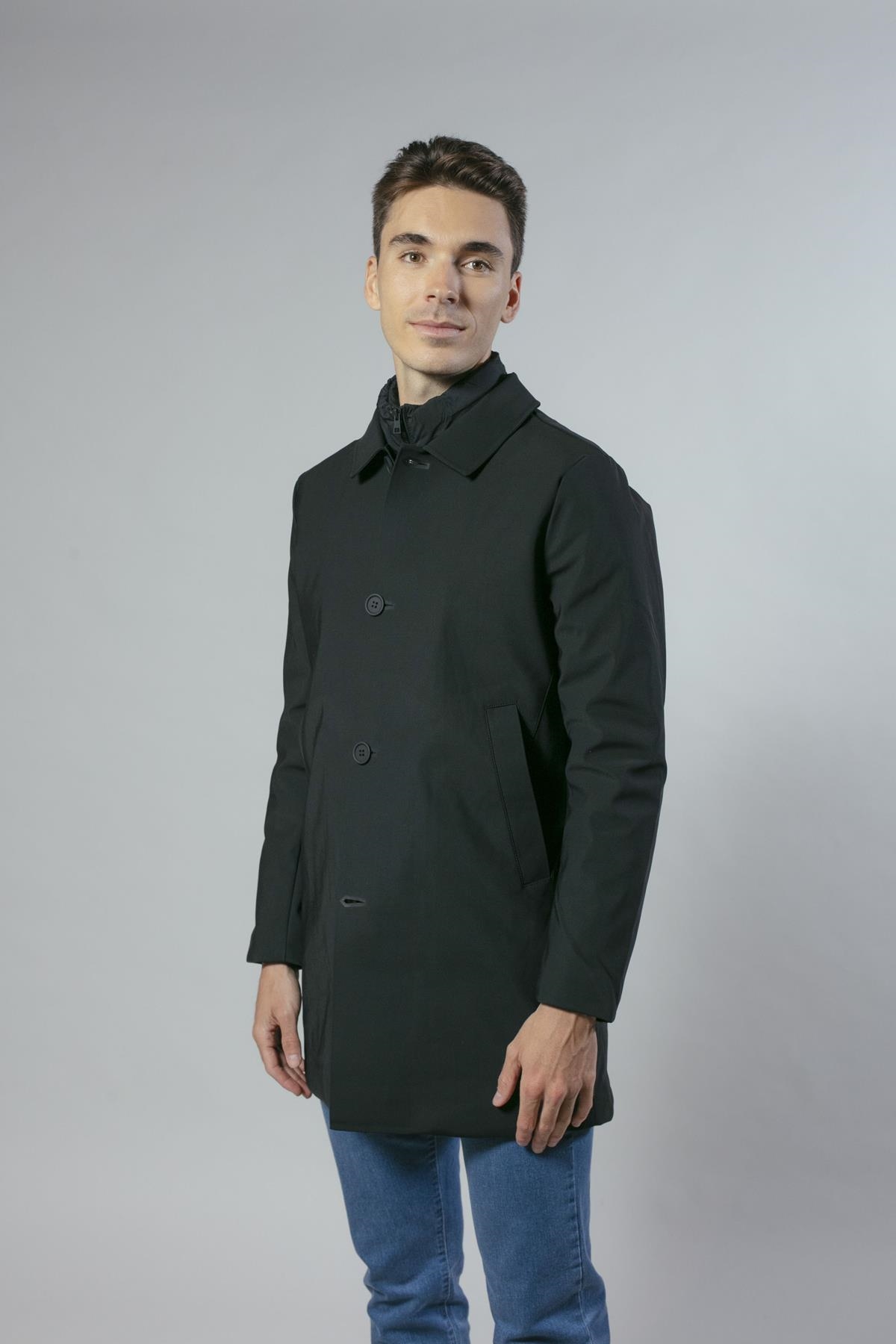 Gabardina en nylon elástico con falso chaleco acolchado extraíble. De corte ligeramente ajustado y bolsillos laterales. Disponible en dos colores: negro y azul marino.