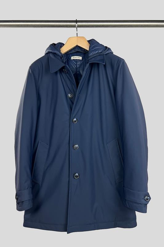 Parka azul marino de corte entallado con bolsillos laterales y capucha acolchada desmontable.