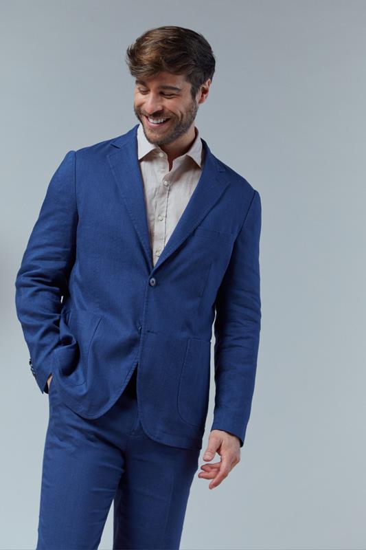 Americana en lino de corte ligeramente entallado. Tiene un bolsillo oculto, dos frontales y cierre de dos botones. Disponible en azul índigo y gris perla. Ambos colores pueden combinarse con nuestro chaleco de lino gris perla.