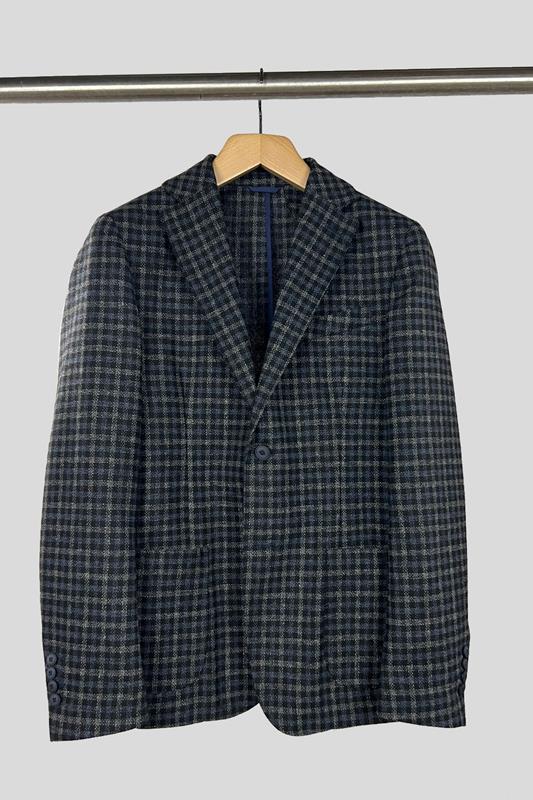 Americana negra de cuadros con bolsillos laterales a vista. Corte entallado.