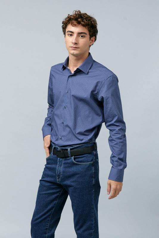 Camisa estampada en pata de gallo en distintos tonos de azul, de manga larga, en algodón elástico y de corte entallado.
