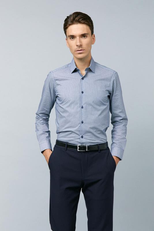 Camisa azul marino estampada con microcuadros blancos, de manga larga, en algodón y de corte entallado.
