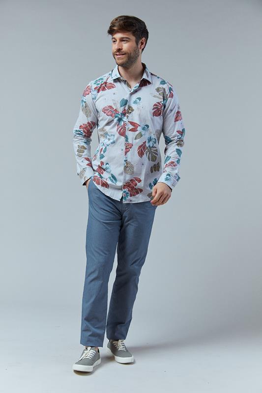Camisa gris estampada con motivos florales de tres colores en algodón fino, de manga larga y corte regular. Tiene los botones cosidos con hilo gris.