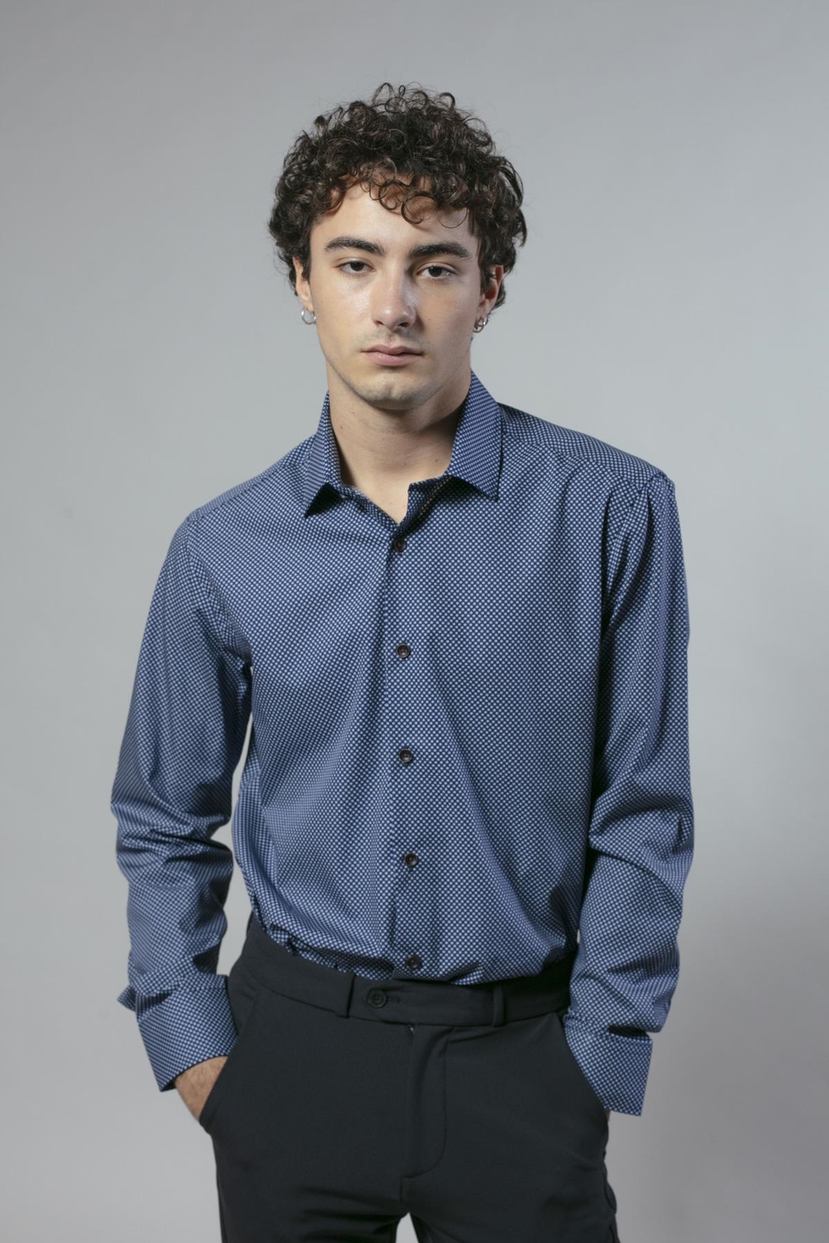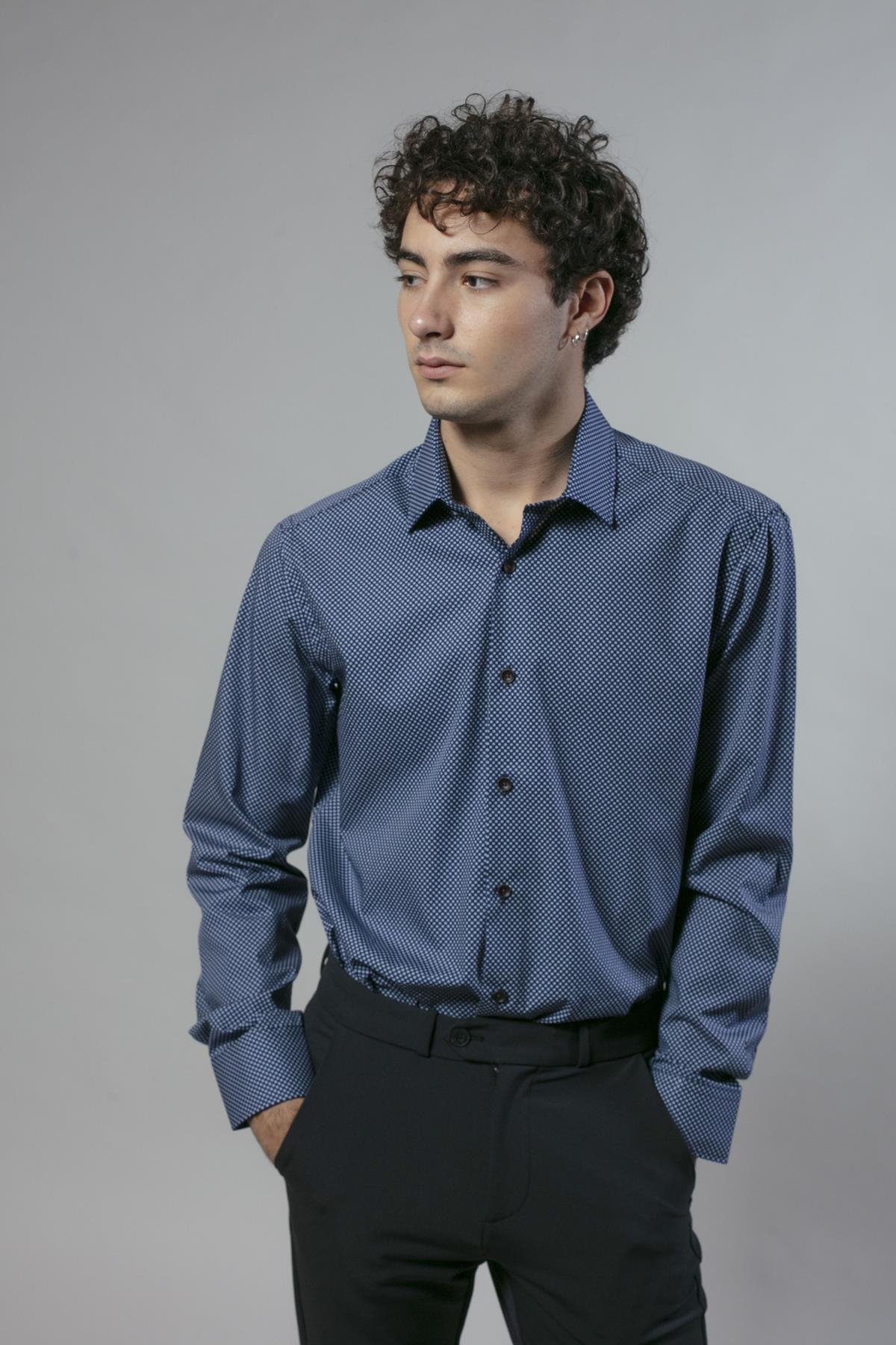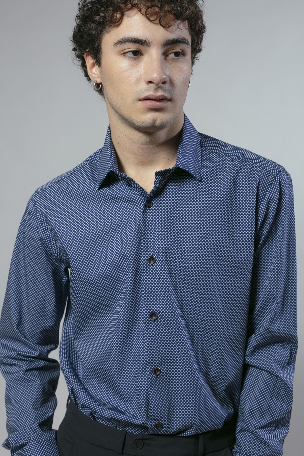 Camisa azul marino en algodón confort, de corte entallado estampada con cuadros pequeños blancos.