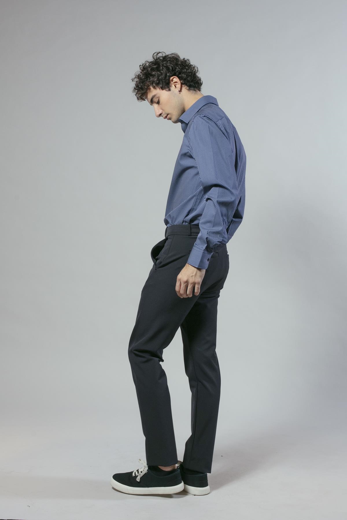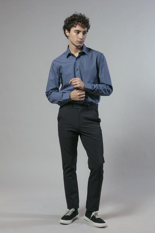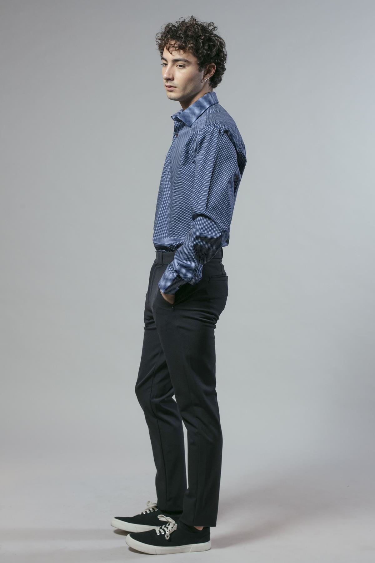 Camisa azul marino en algodón confort, de corte entallado estampada con cuadros pequeños blancos.