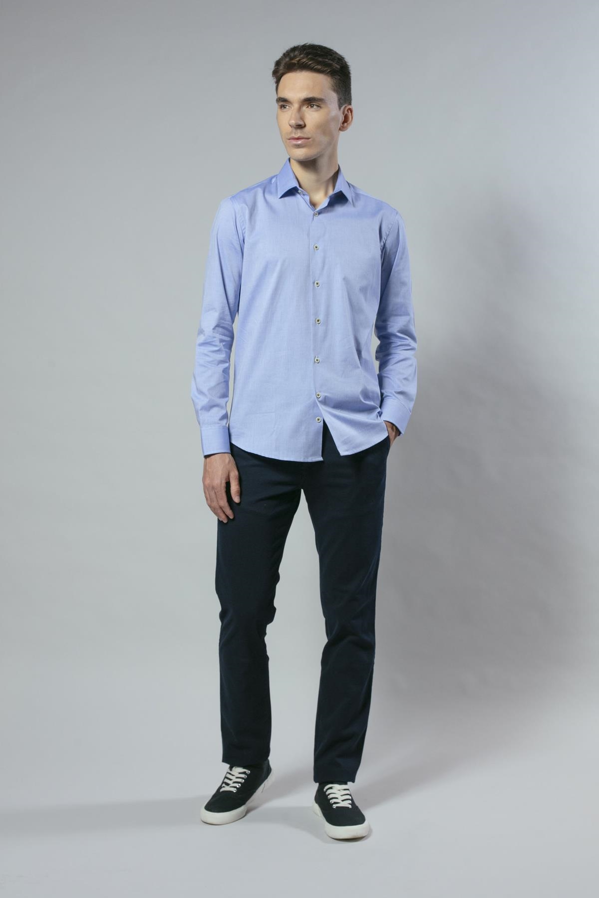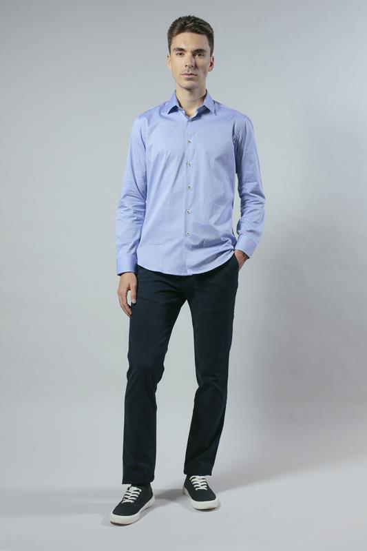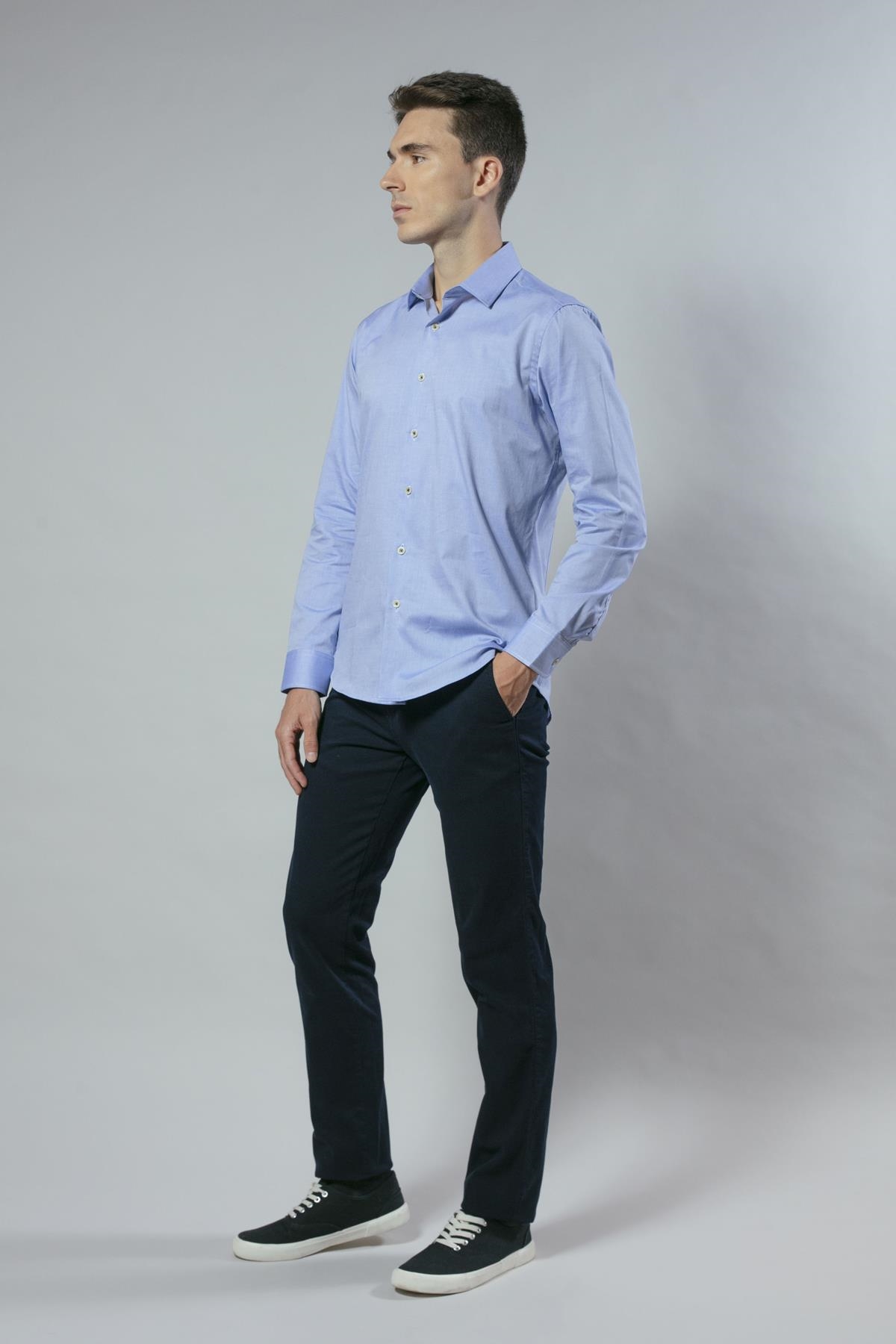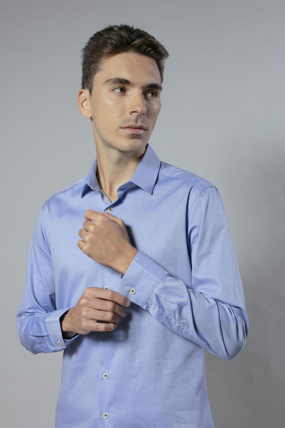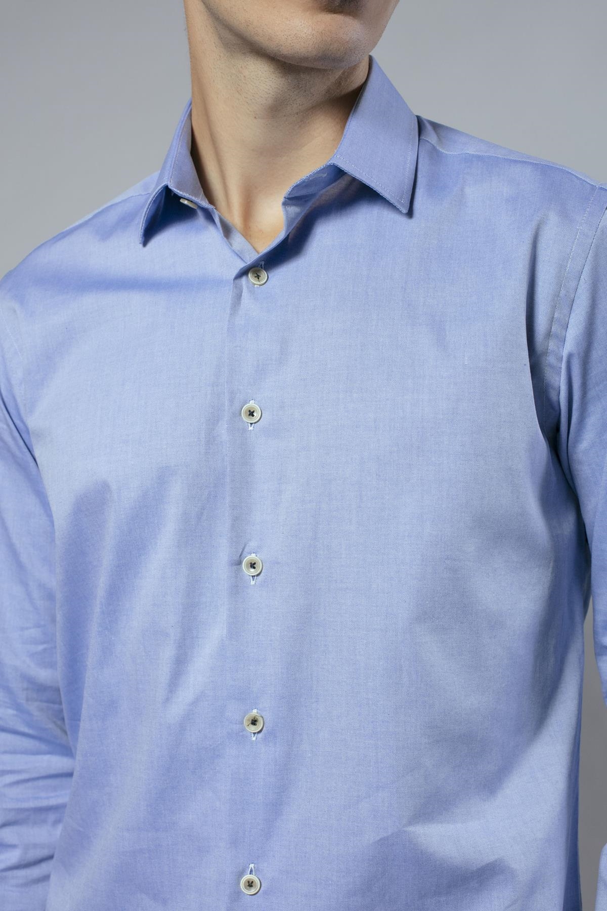 Camisa azul celeste en falso liso de algodón y corte entallado.