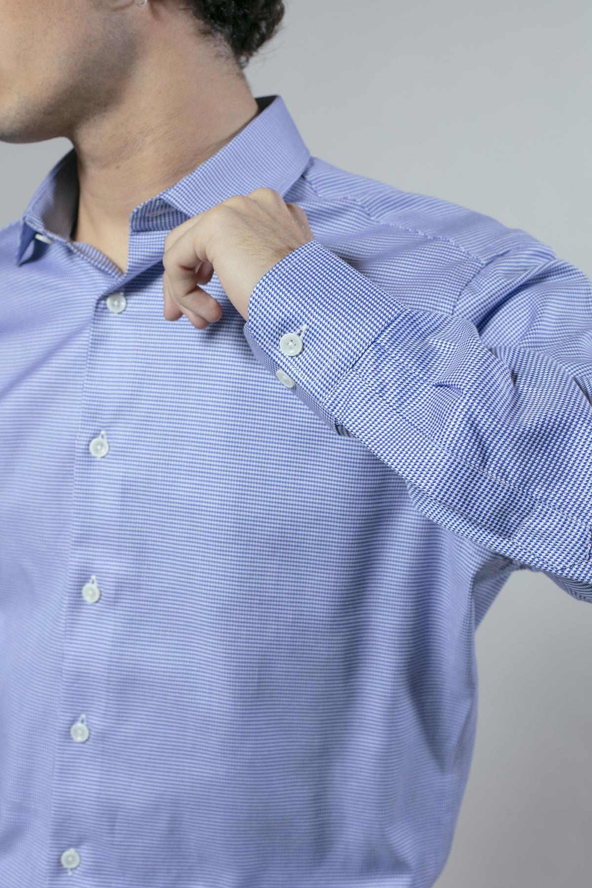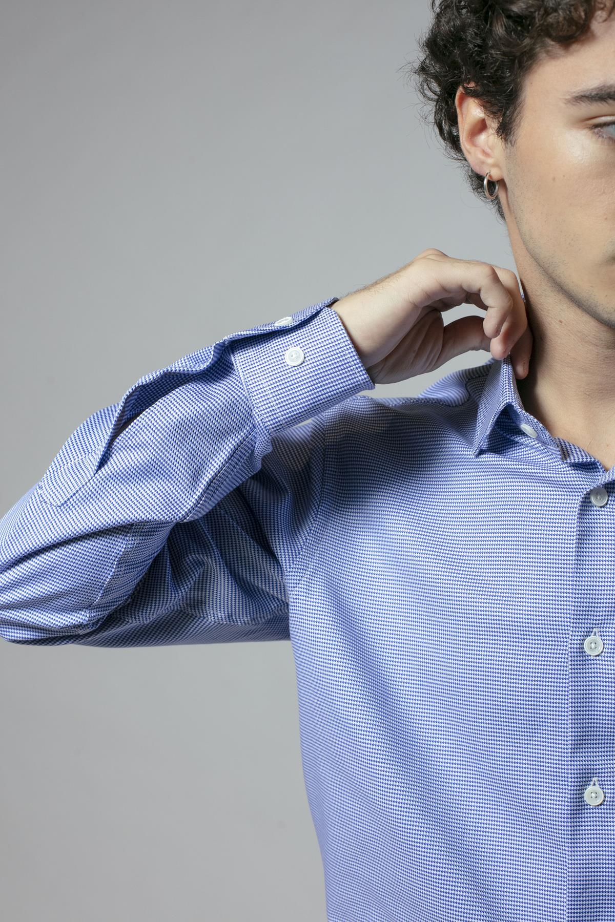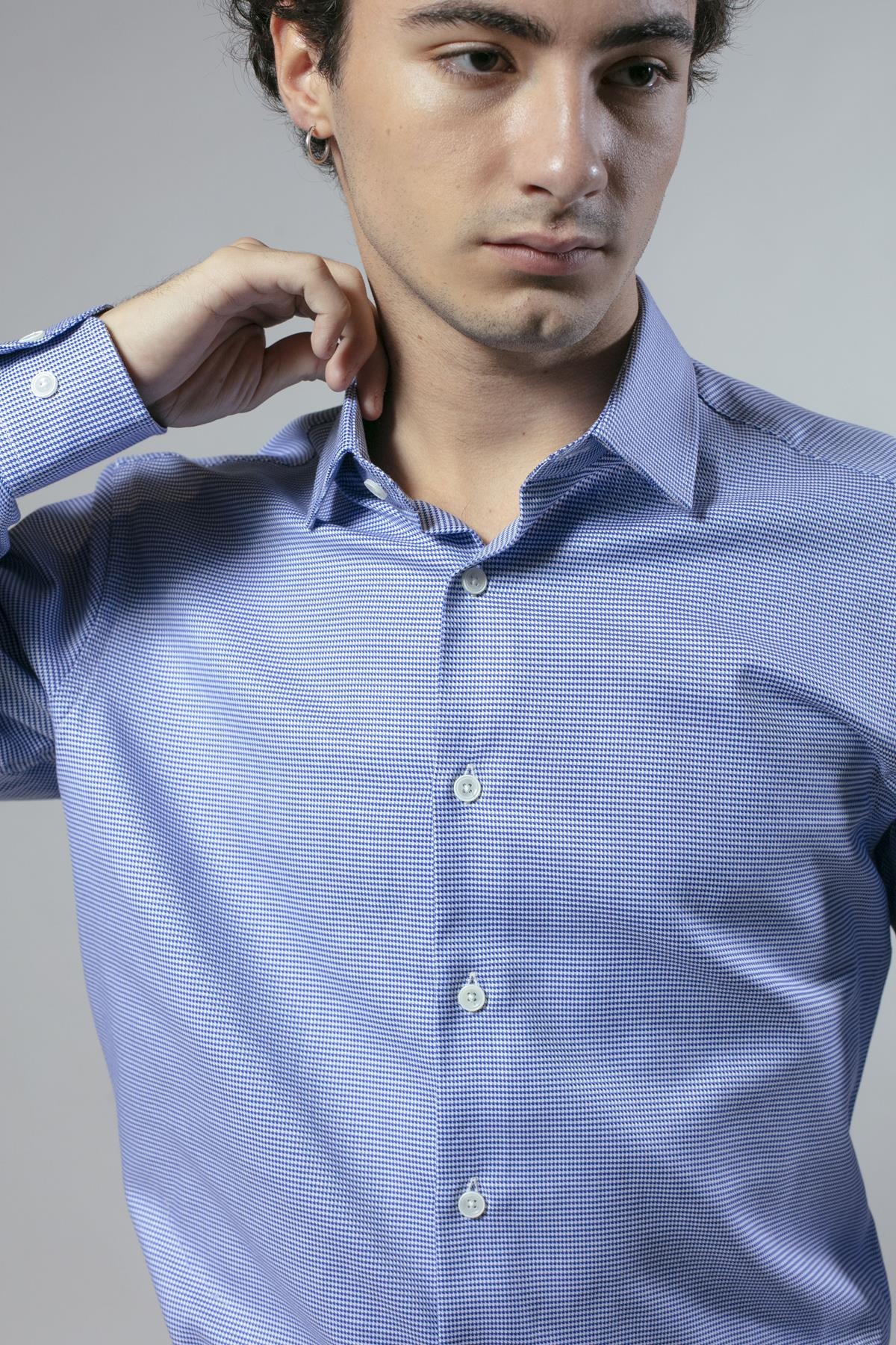 Camisa azul en algodón, de corte entallado y estampada en pata de gallo.