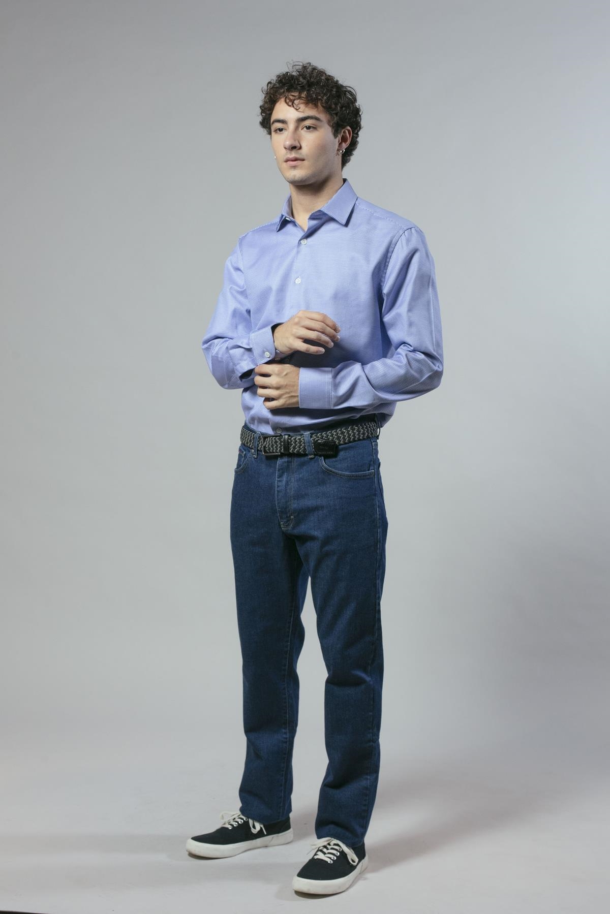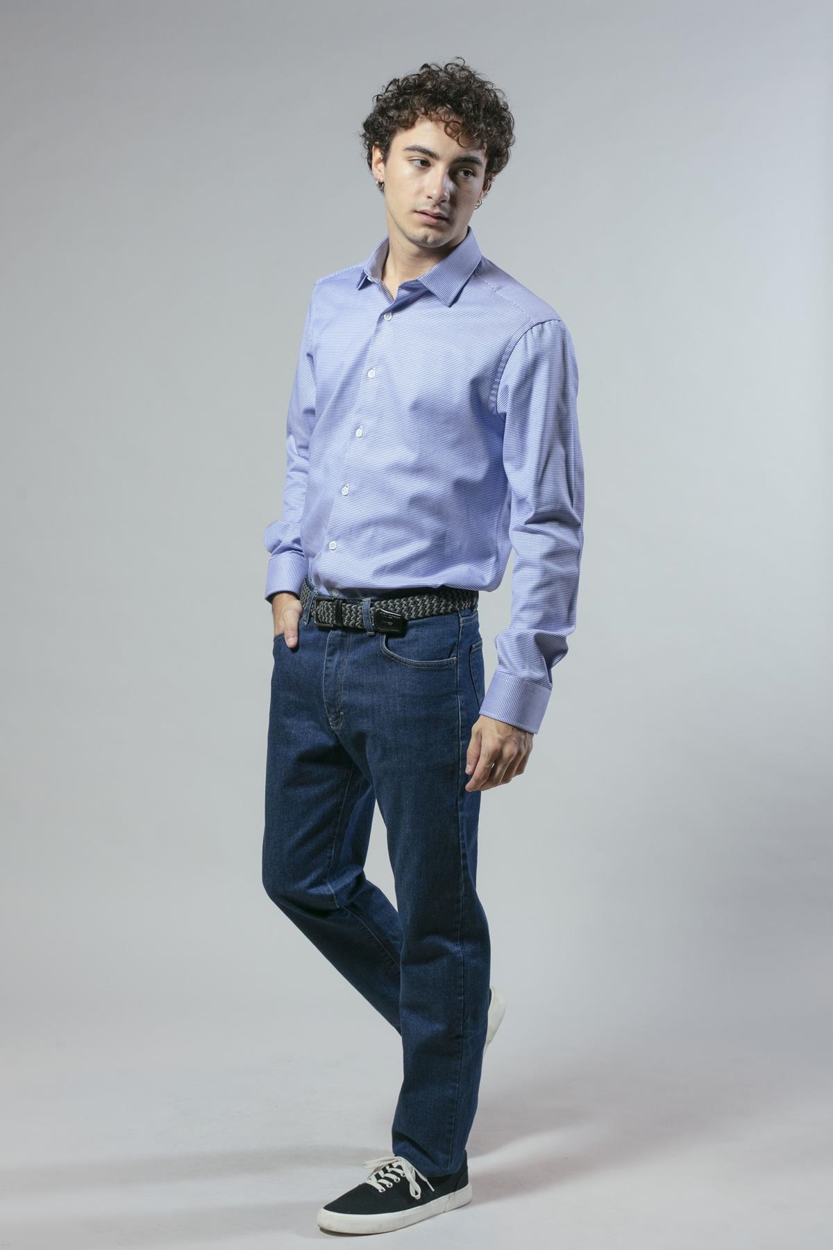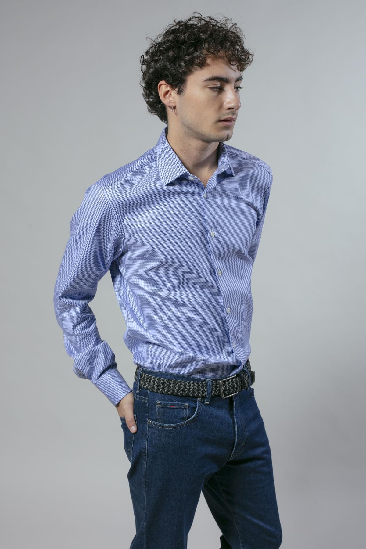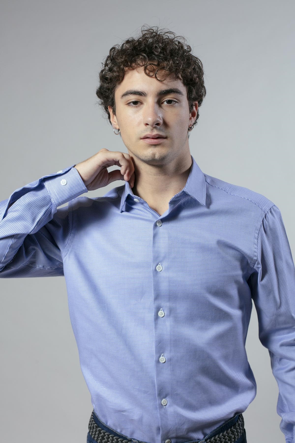 Camisa azul en algodón, de corte entallado y estampada en pata de gallo.