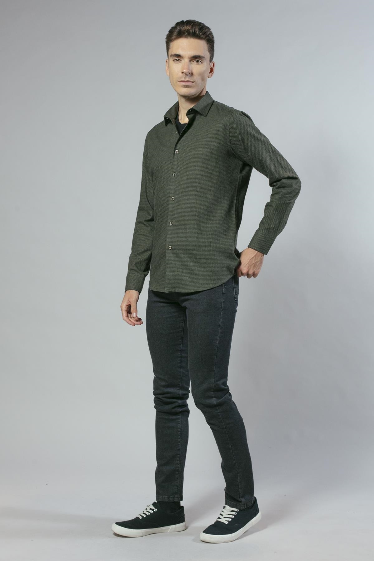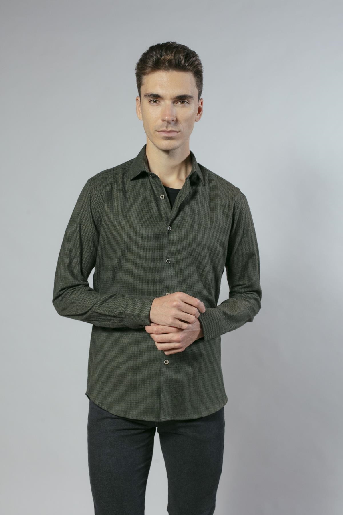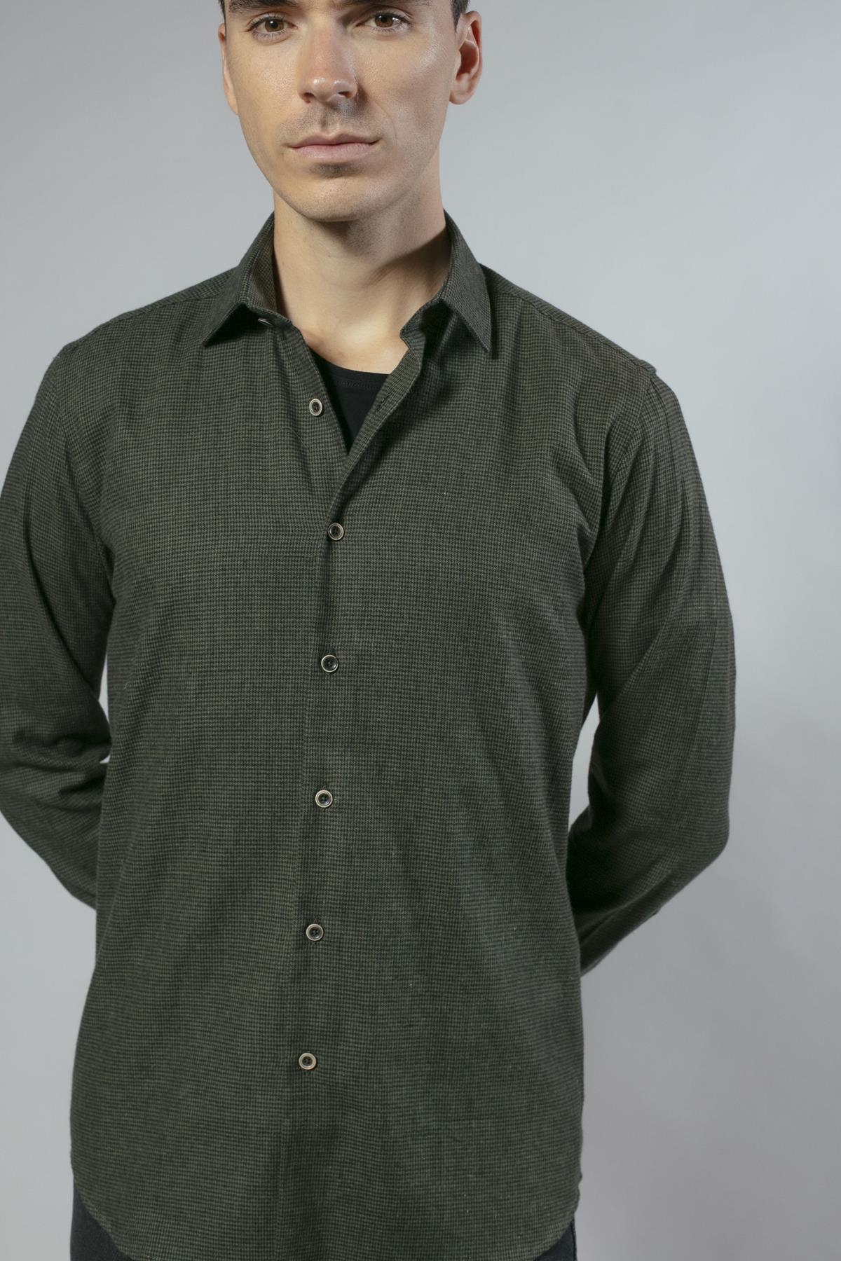 Camisa verde en algodón grueso, de corte entallado y estamapada en pata de gallo.