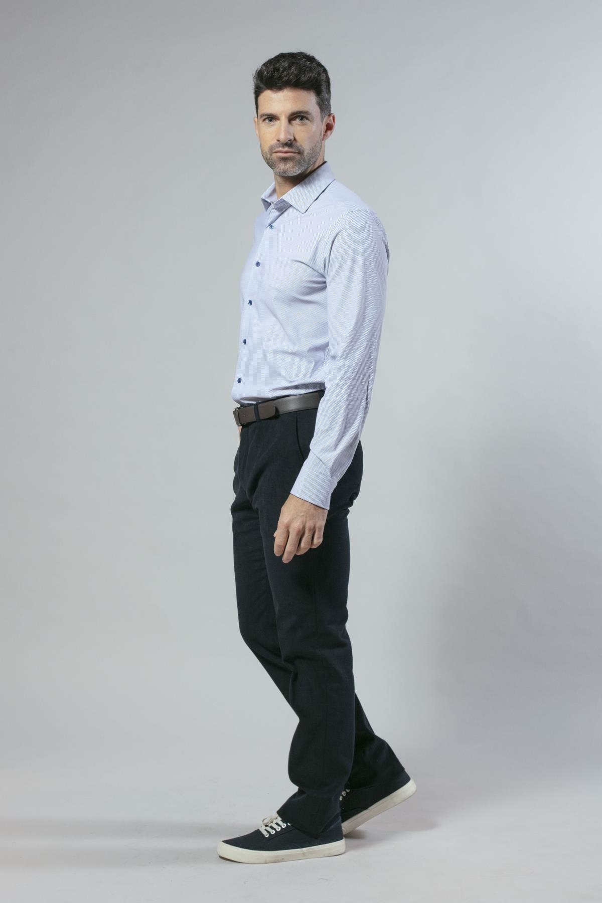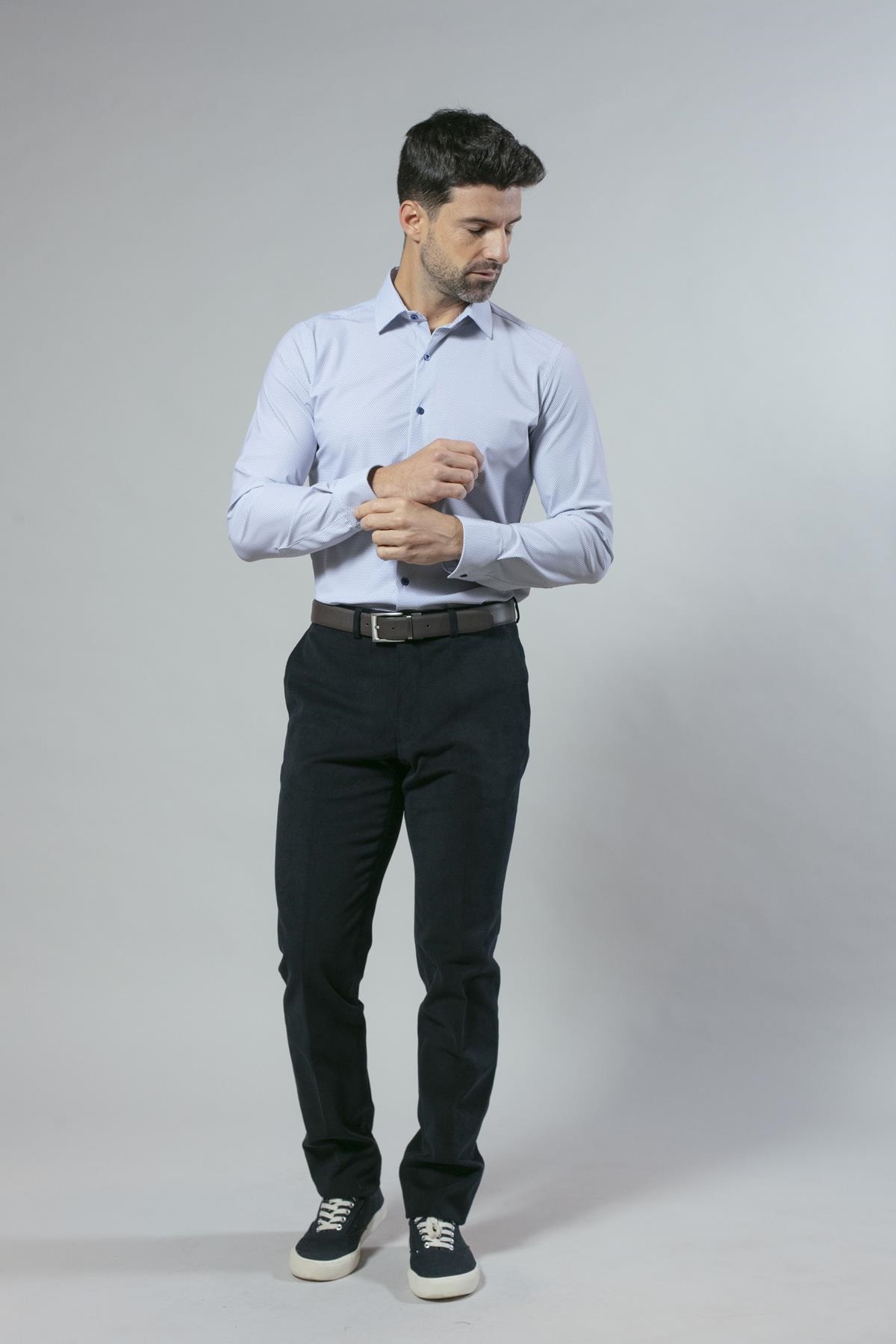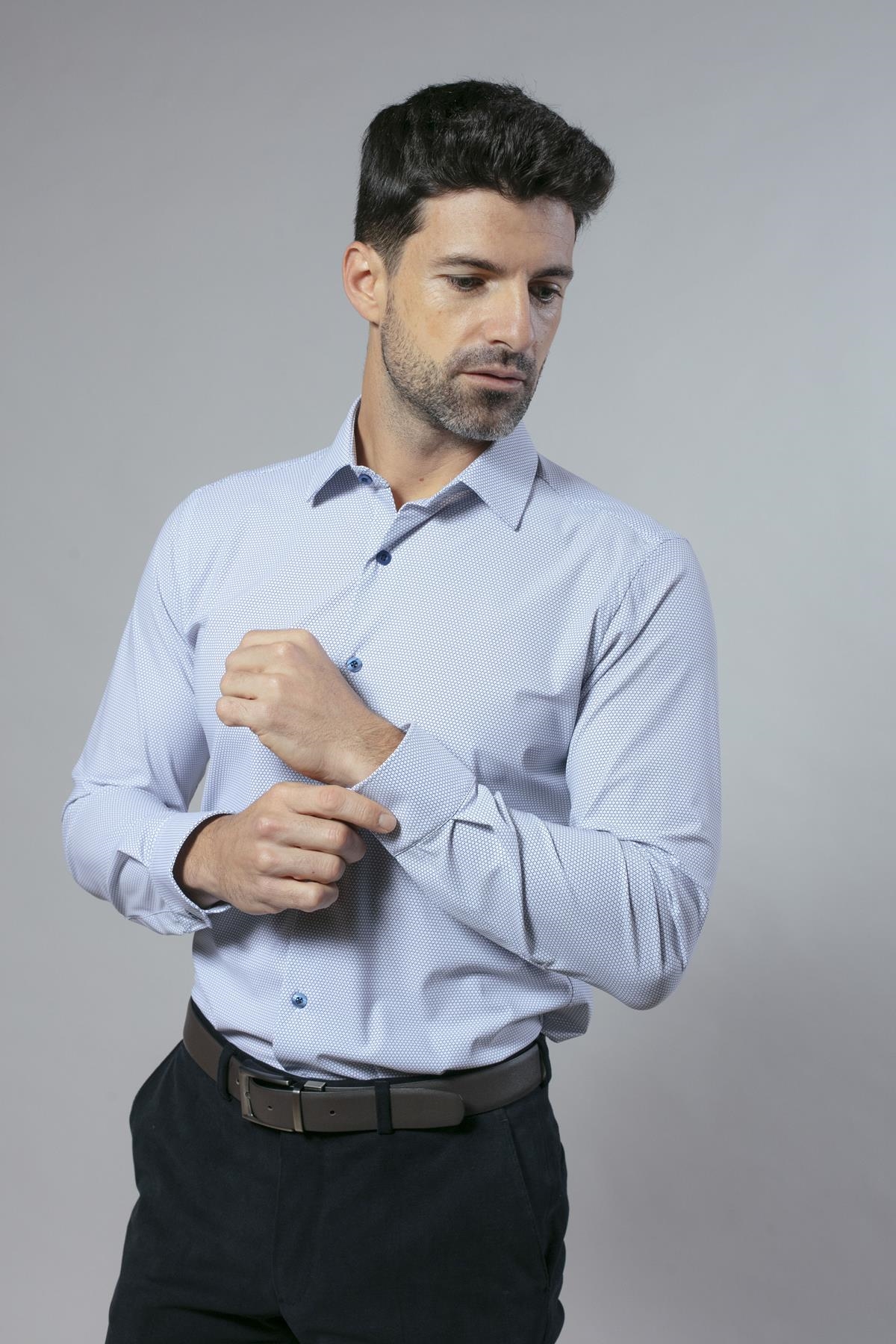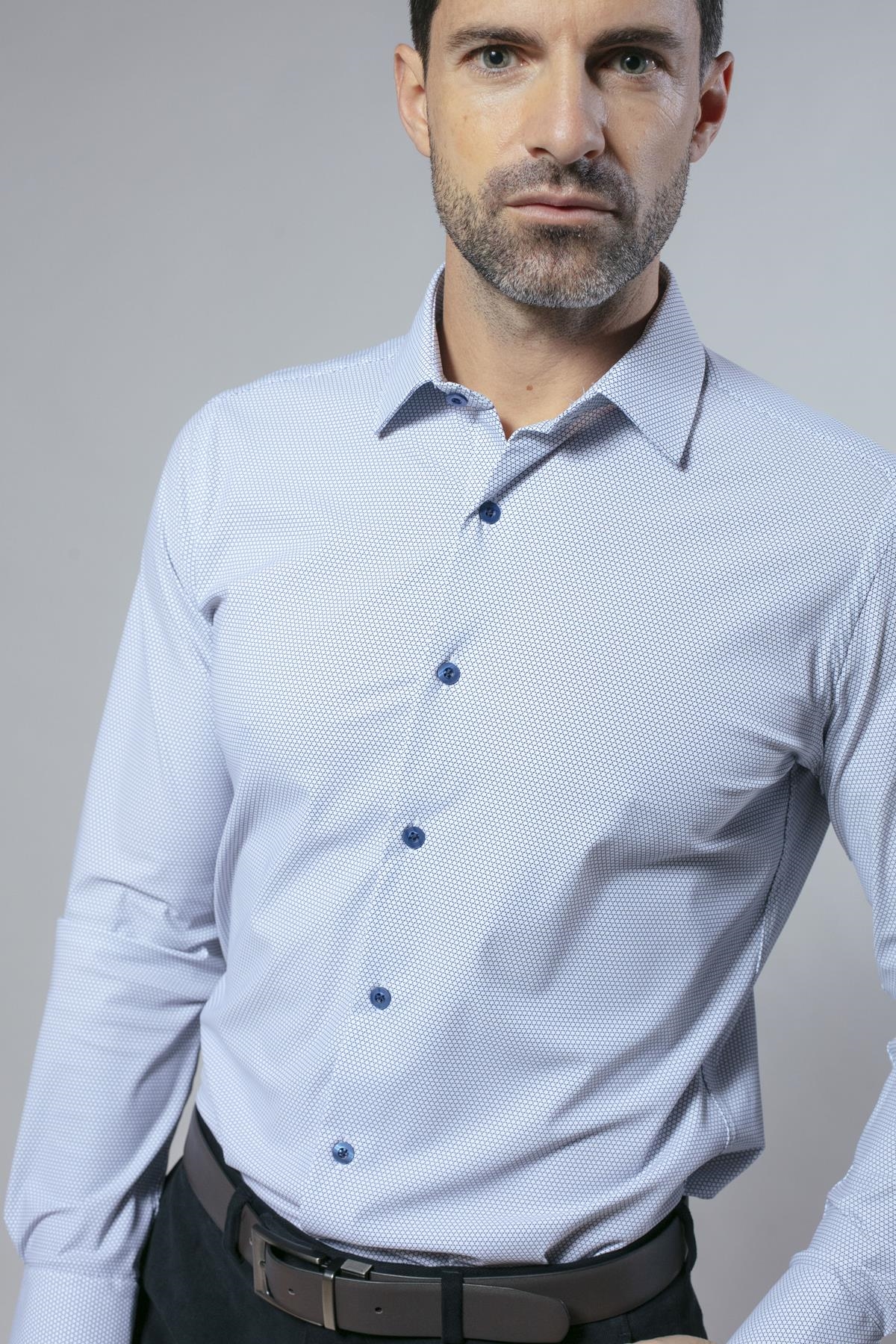 Camisa no iron en nylon y spandex de corte entallado. Disponible en tres estampados con microdibujos geométricos.