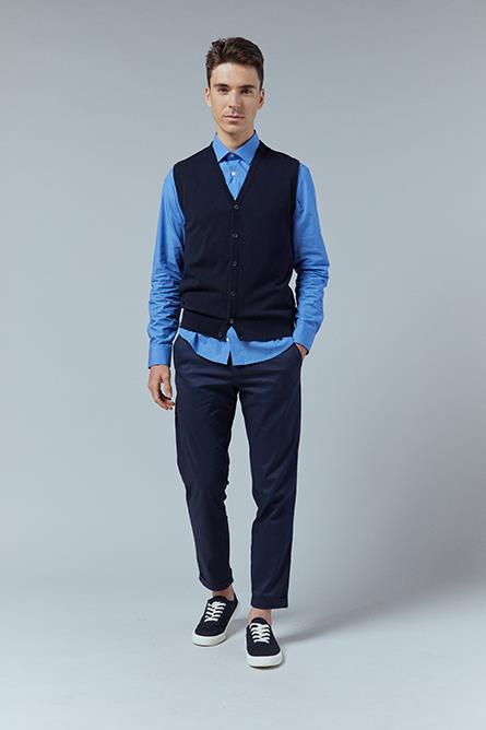 Chaleco azul marino en punto de algodón, con cuello de pico y cierre de botones. Puede llevarse debajo de cualquiera de nuestras americanas o por separado, consiguiendo así un look más informal si además se combina con una camiseta o camisa estampada.
