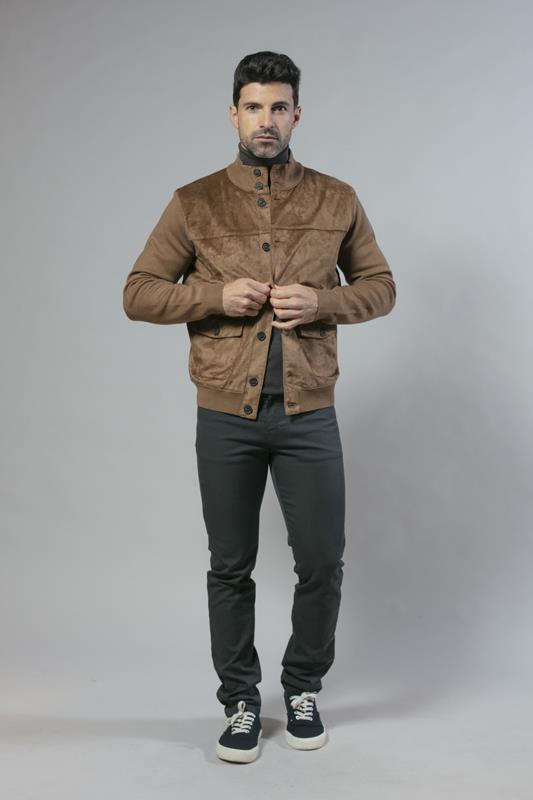 Chaqueta camel en lana con frontal de antelina. De corte ligeramente regular, tiene el cuello y los puños en canalé, cierre de botones y dos bolsillos.