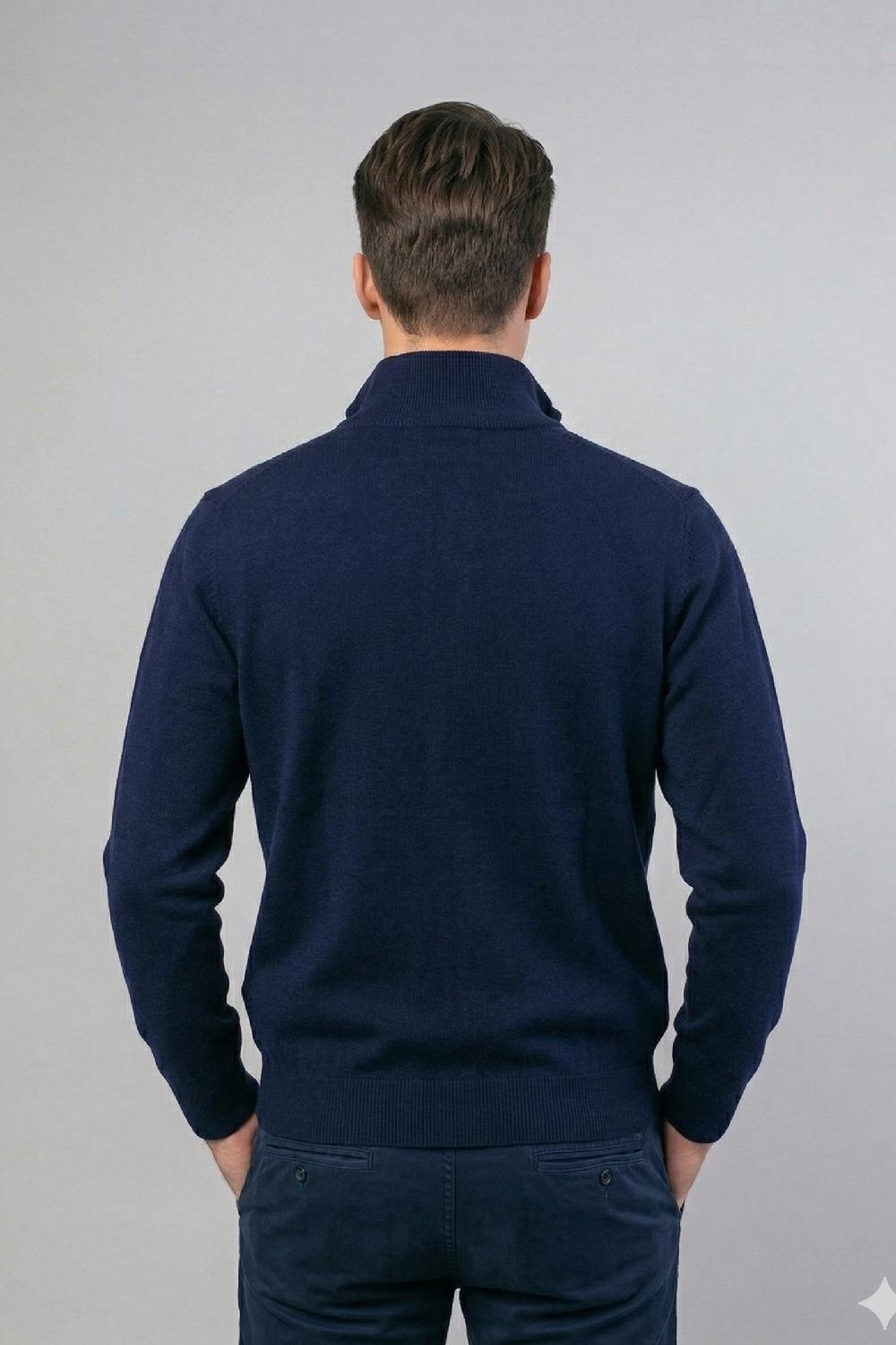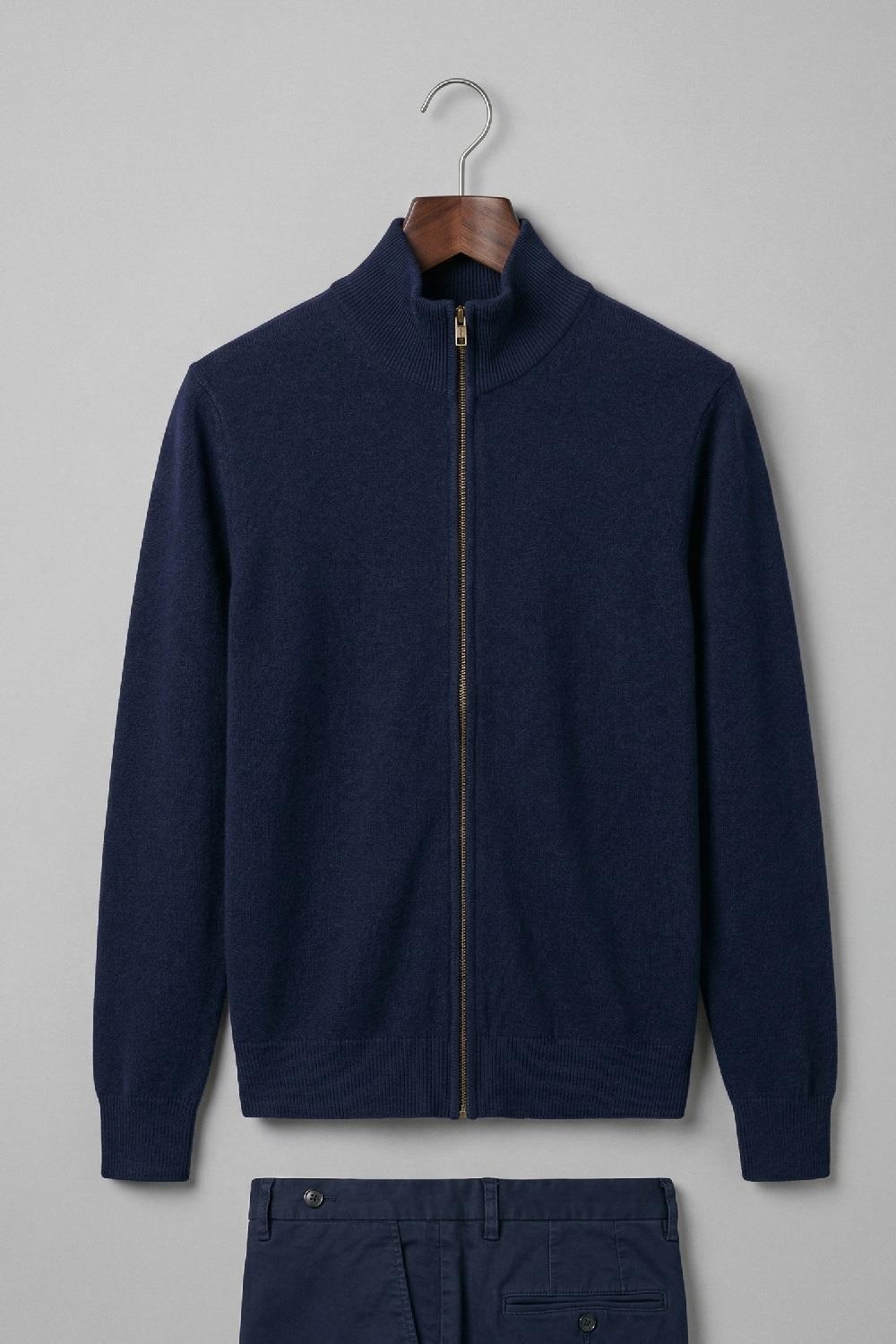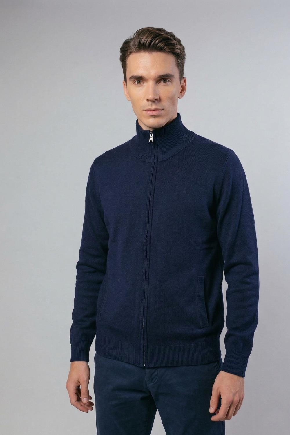 Chaqueta en punto de algodón, de corte regular y cuello tipo polo. Tiene dos bolsillos laterales, cierre de cremallera y canalé en puños y bajo. Disponible en color azul marino y eléctrico.