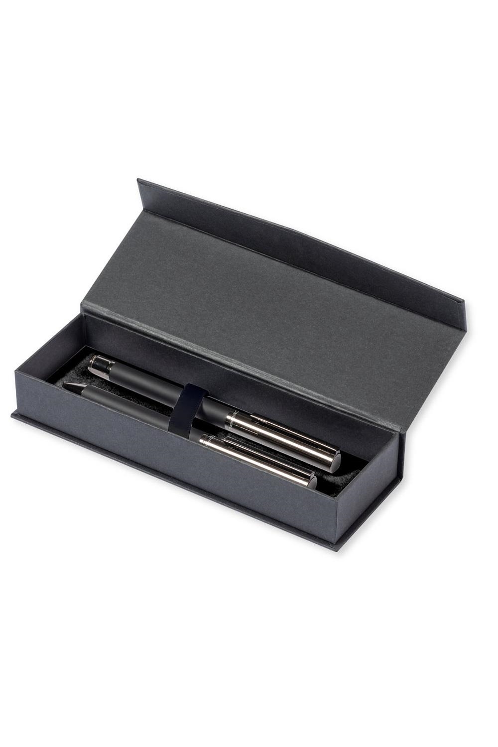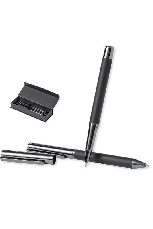 Bolígrafo metálico con cuerpo en negro mate. Detalles y capucha en cromado con logotipo de la marca cartucho jumbo y en tinta azul. Roller metálico con cuerpo en negro mate. Detalles y capucha en cromado con logotipo de la marca. Cartucho jumbo y en tinta azul. Presentado en elegante y resistente estuche individual negro con logotipo Antonio Miró, cierre magnético y funda de protección a juego. Bolígrafo y Roller. Carga Jumbo Metal.