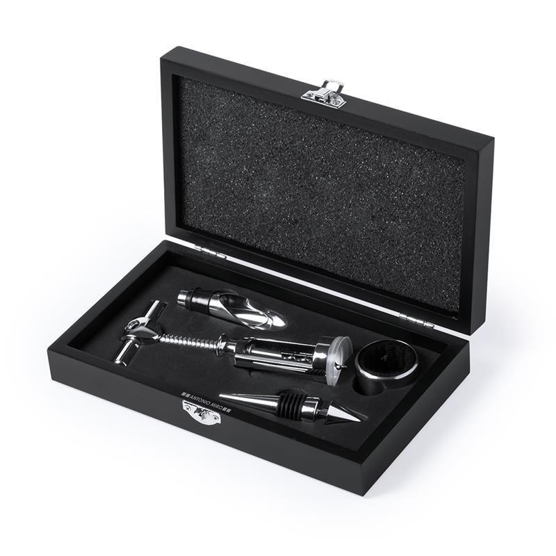 Set de abridor de botellas de Antonio Miró presentado en elegante caja de madera con cierre metálico e interior troquelado. Incluye tapón dosificador, sacacorchos, recoge gotas y tapón.