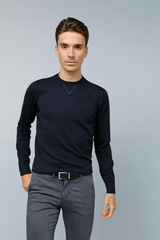 Jersey azul marino en punto fino de viscosa, con detalle gris en el cuello y manga larga.