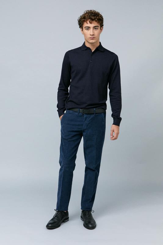 Jersey azul marino en punto de lana fina, con cuello de polo, cierre de tres botones y manga larga.