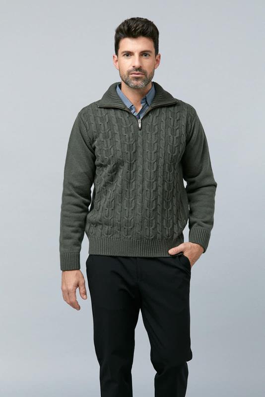 Jersey en lana gruesa con cuello ziper de corte regular. Disponible en verde y azul petróleo.