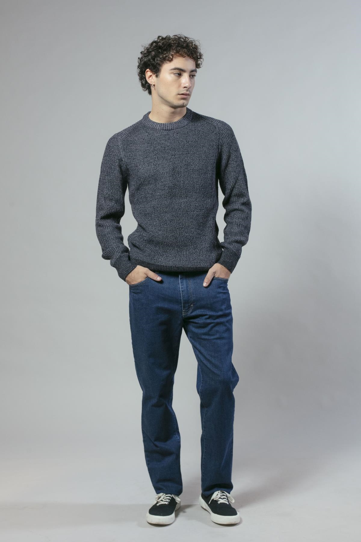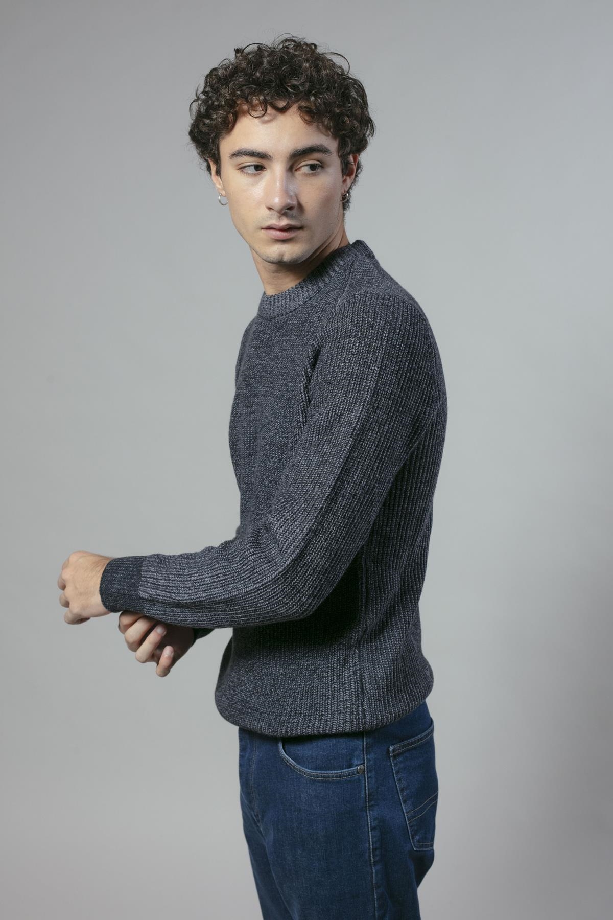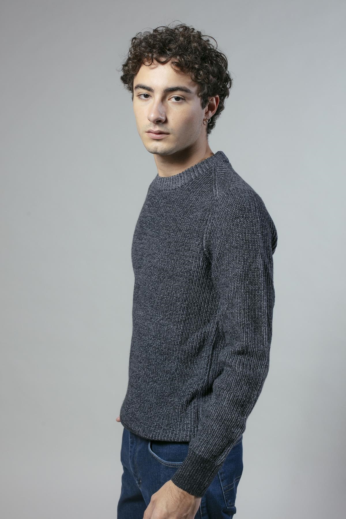 Jersey azul marino jaspeado en gris, de corte ligeramente regular, cuello redondo y manga larga en lana gruesa.