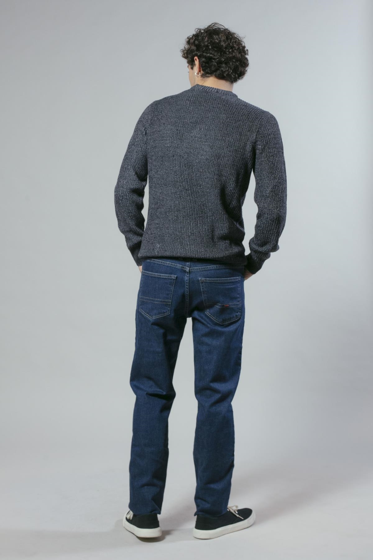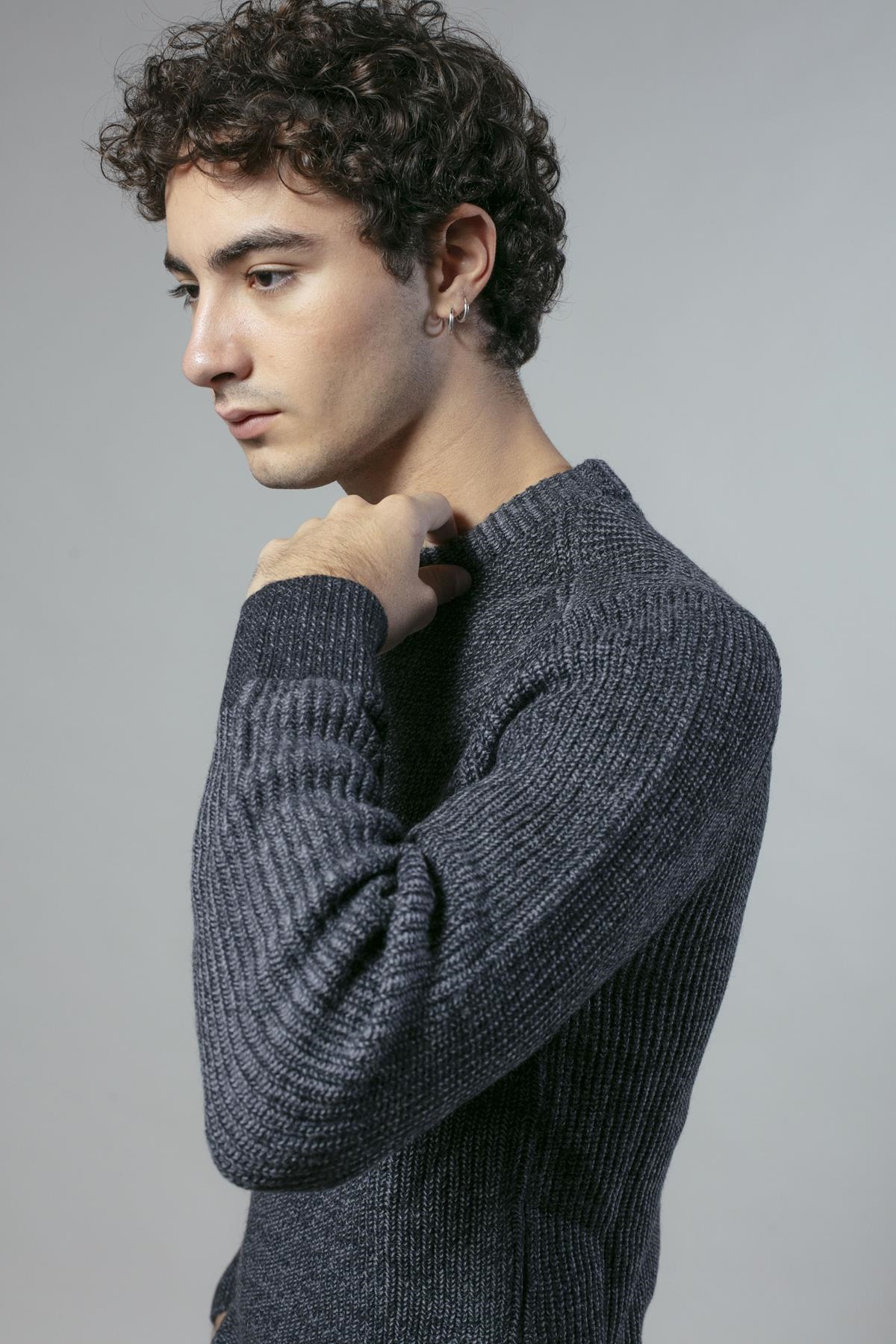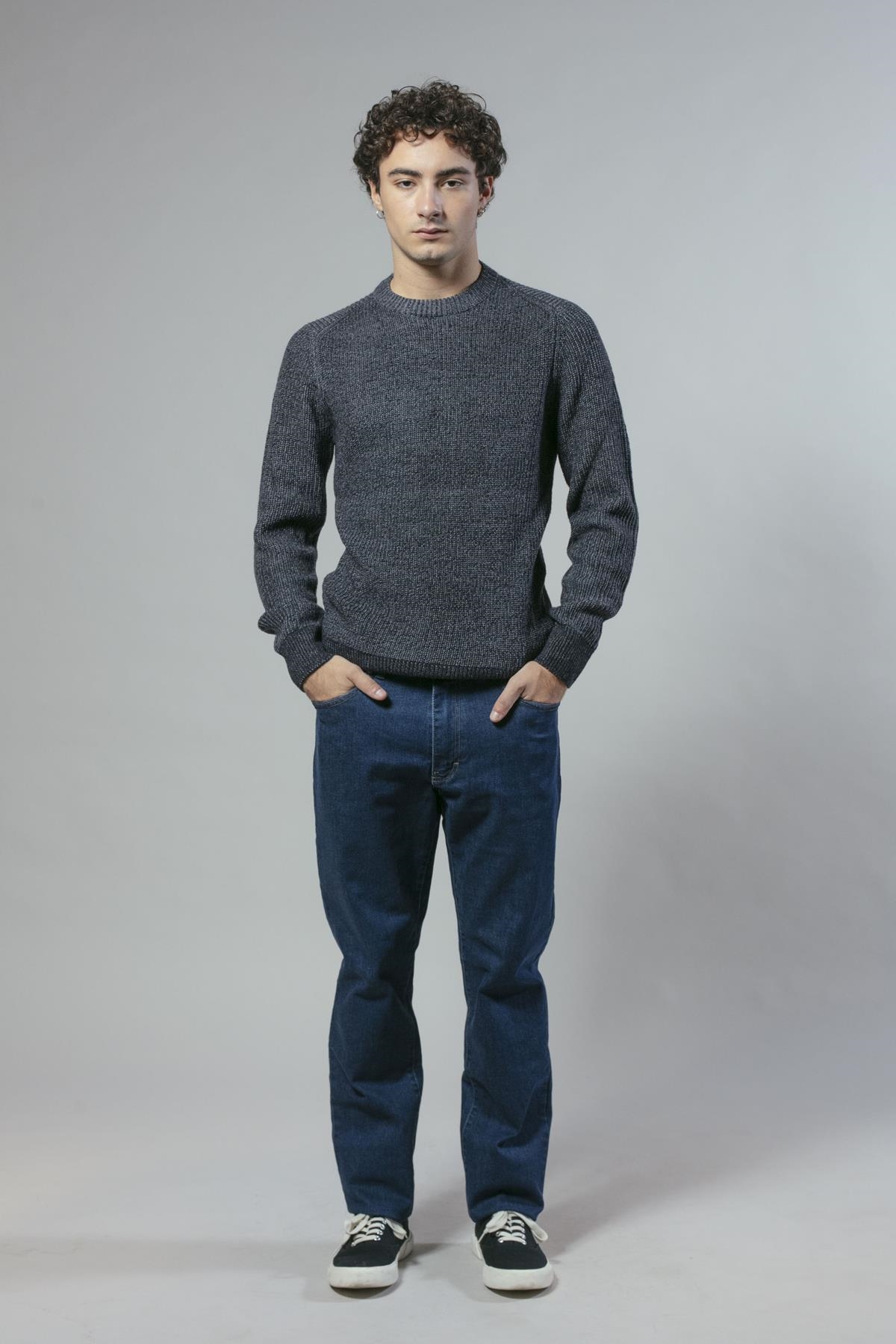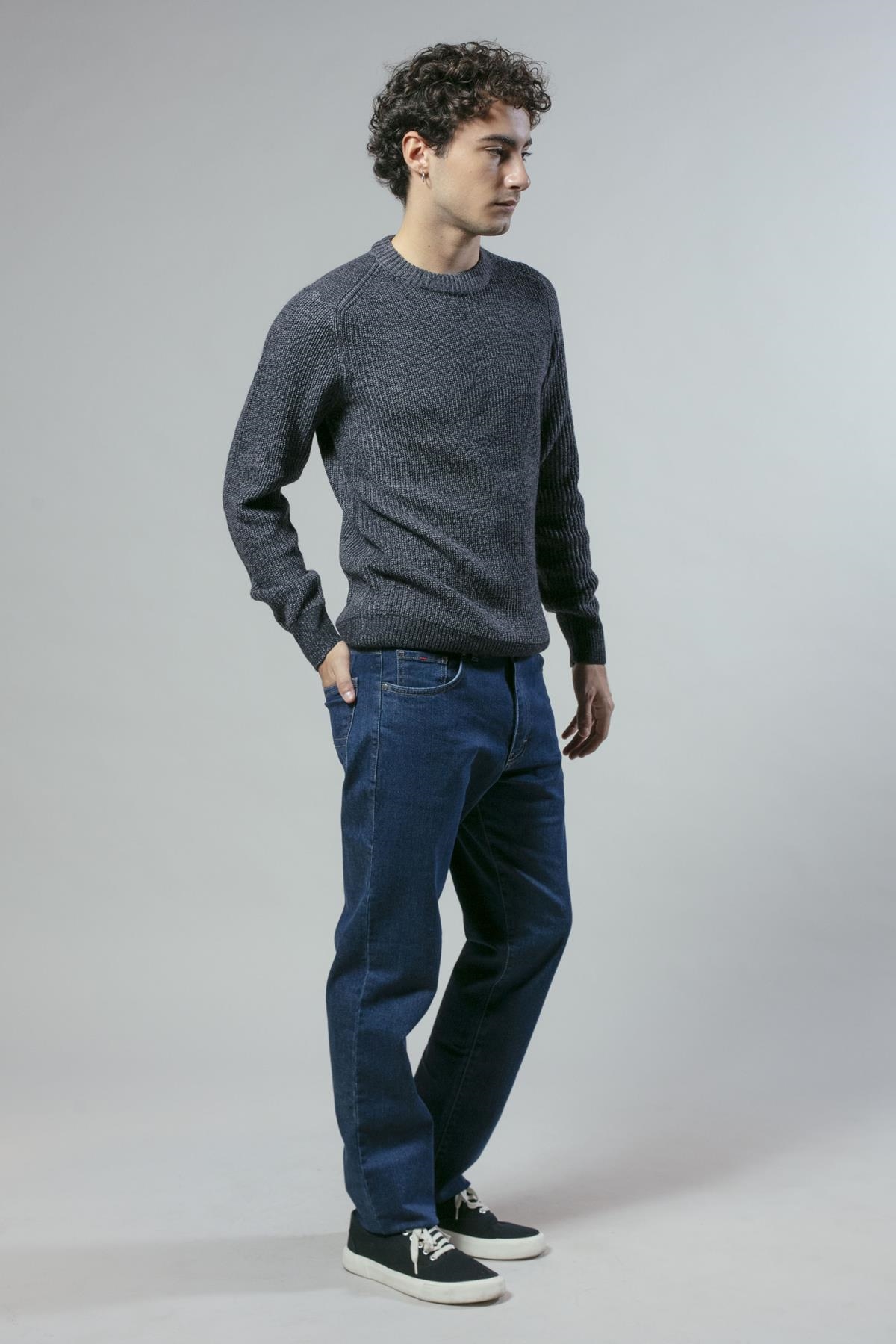 Jersey azul marino jaspeado en gris, de corte ligeramente regular, cuello redondo y manga larga en lana gruesa.