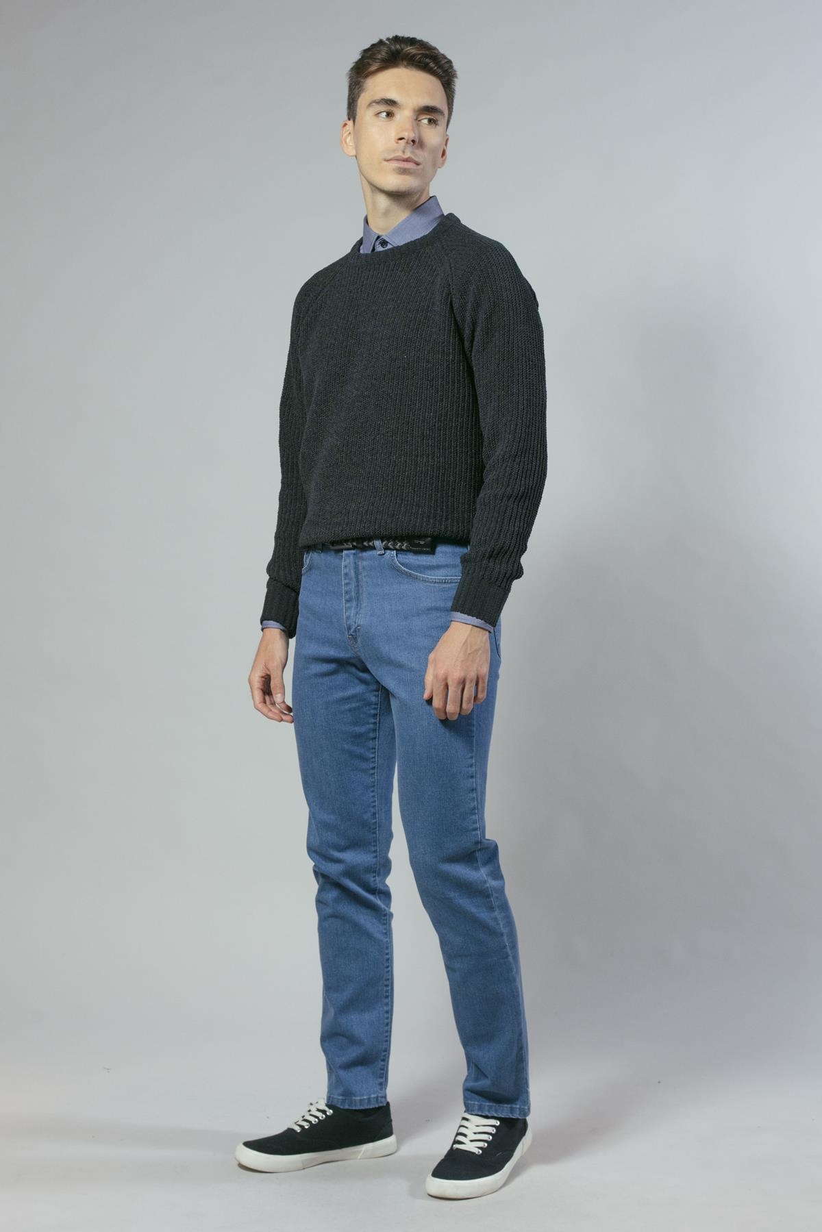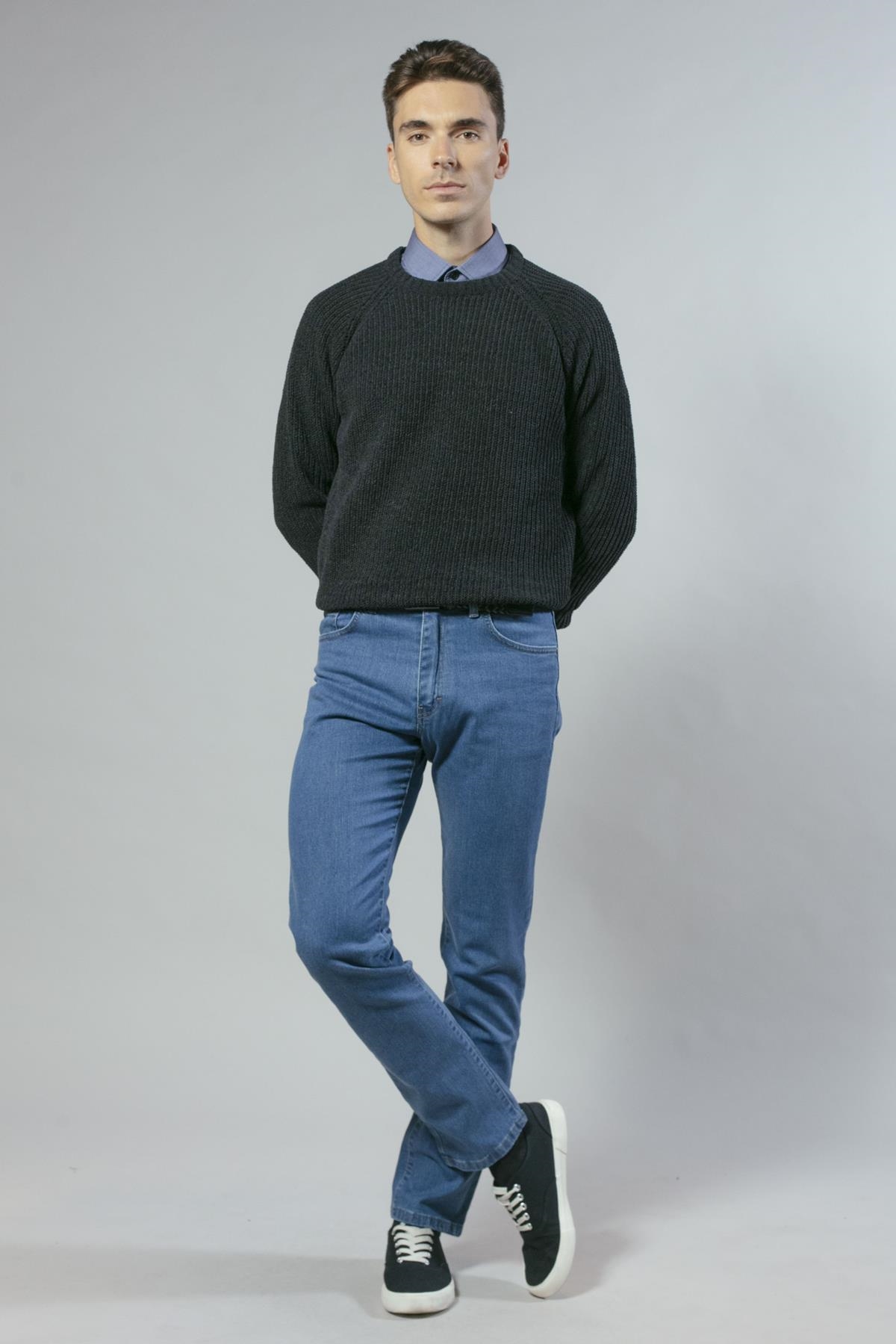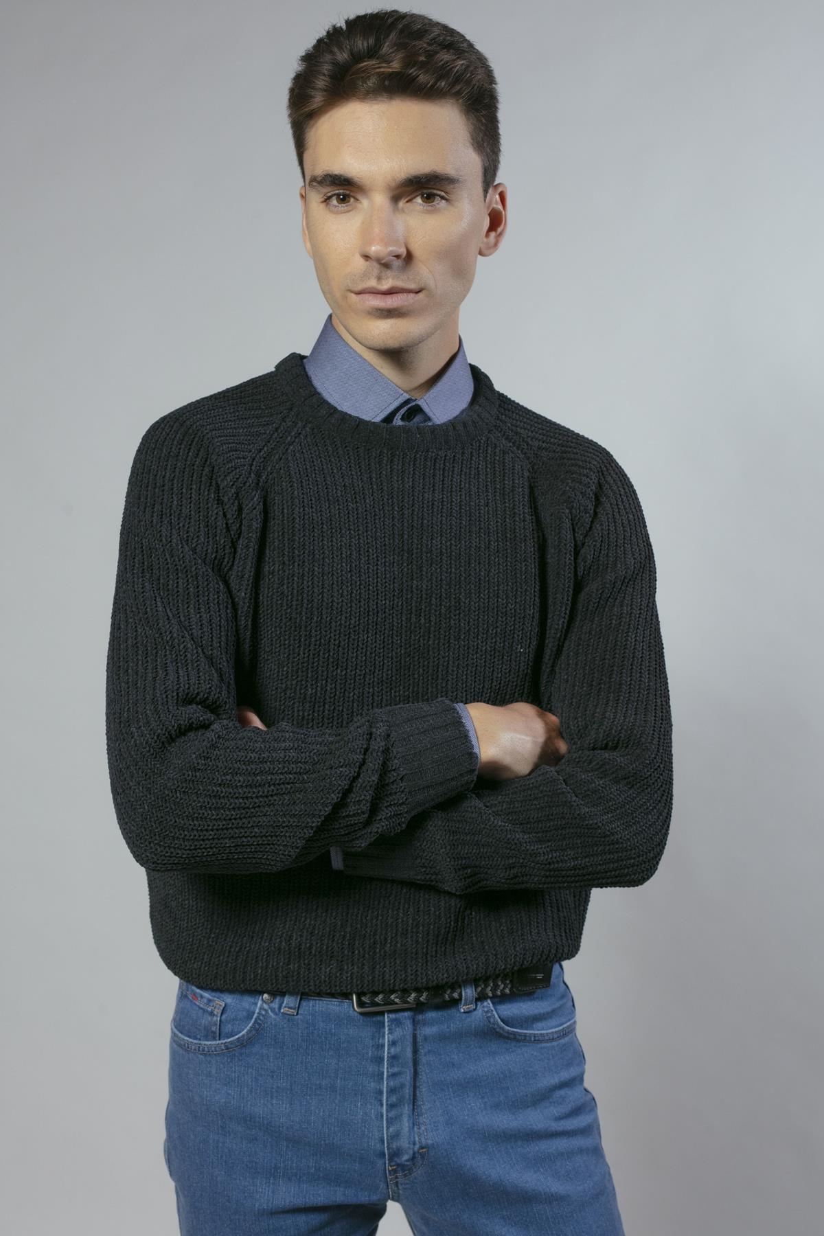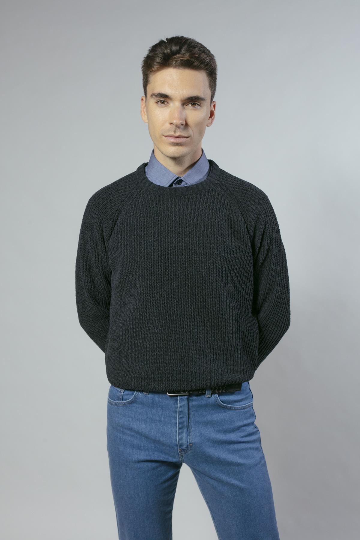 Jersey en punto grueso, de corte ligeramente regular, cuello redondo y manga larga. Disponible en cuatro colores: negro, azul marino, verde y granate.