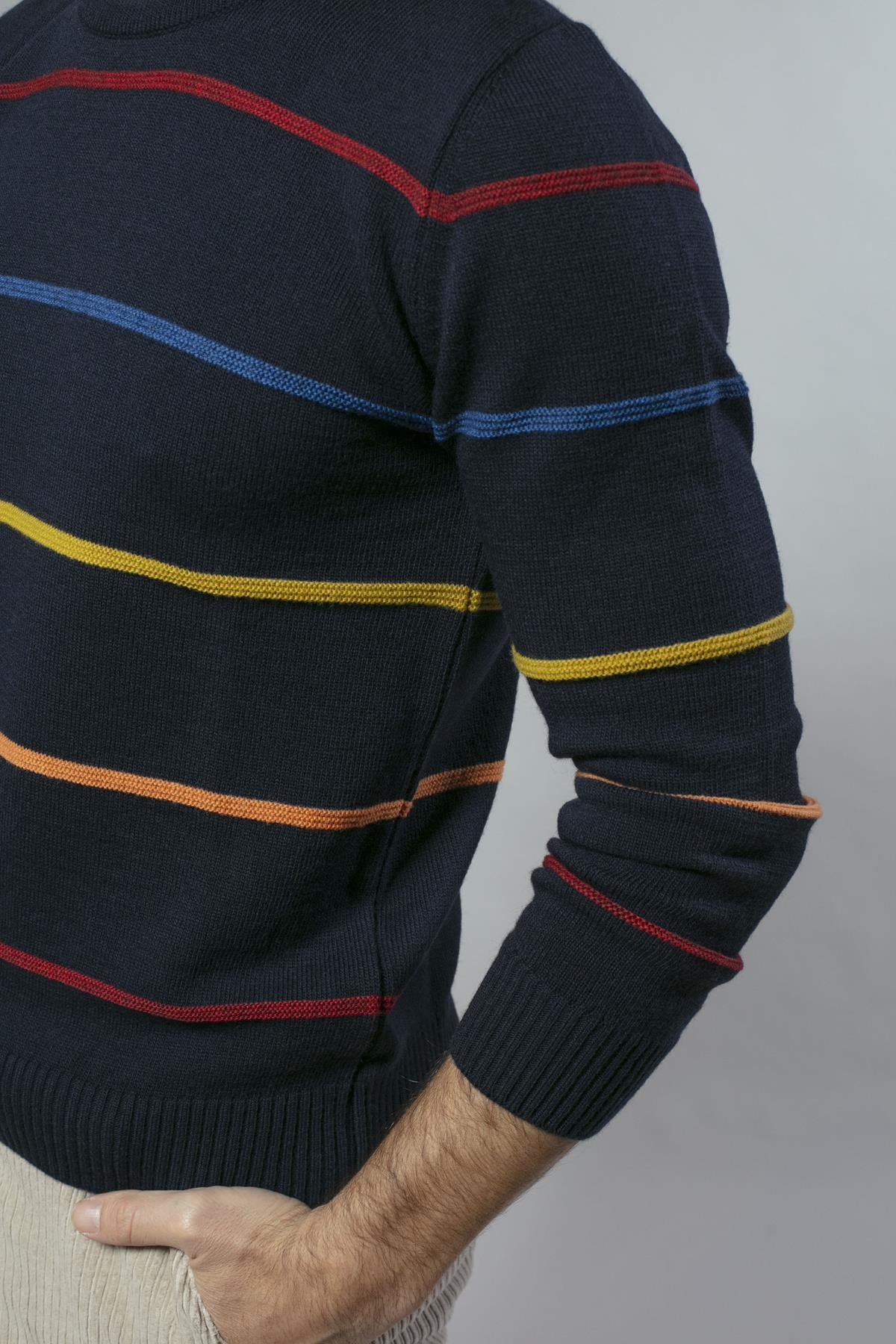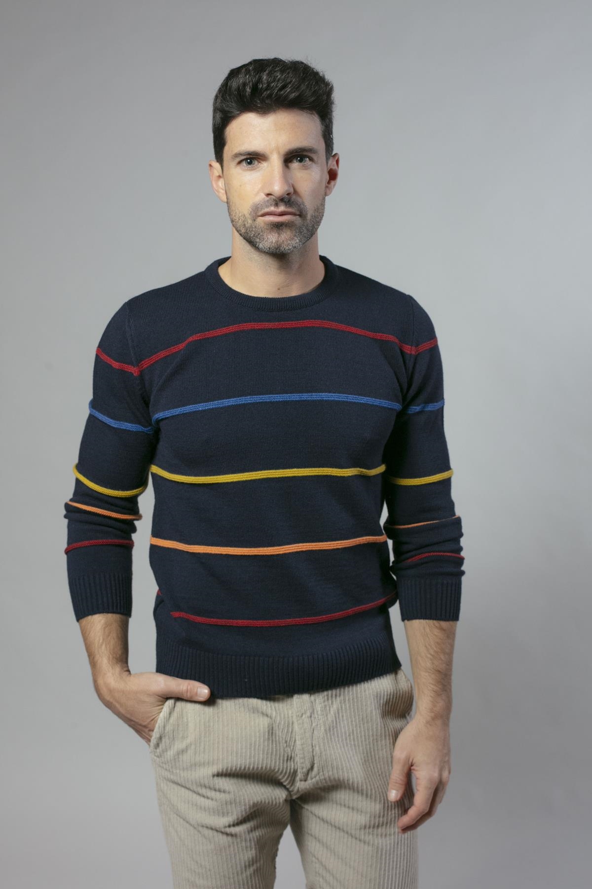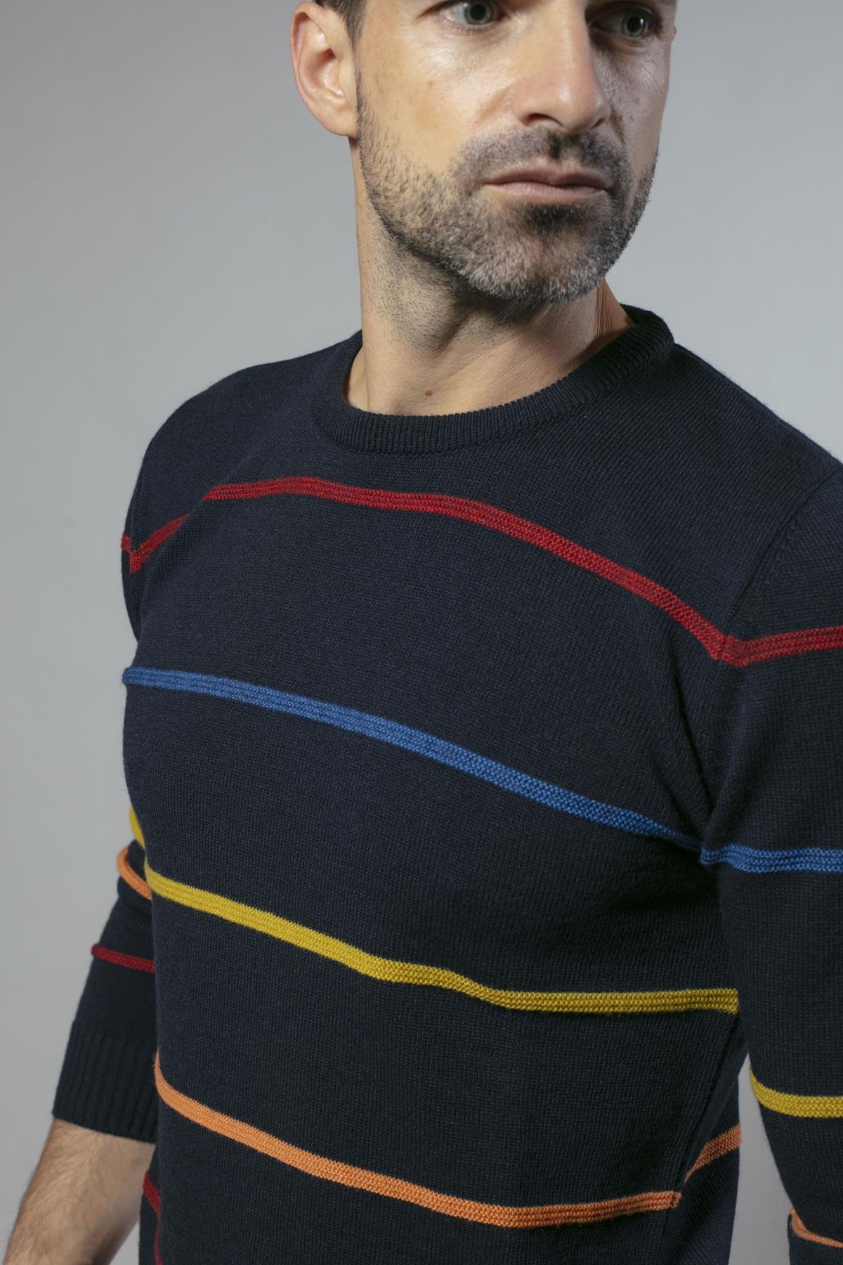Jersey azul marino y rayas de varios colores, de corte ligeramente regular y cuello redondo en punto de mezcla de lana.