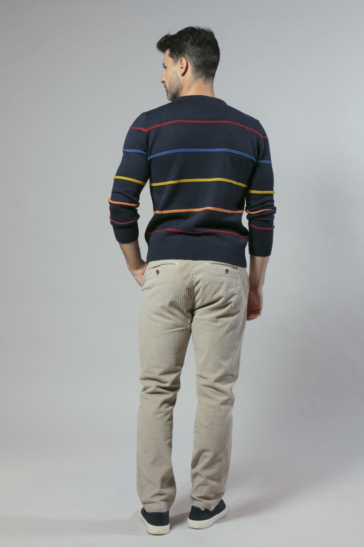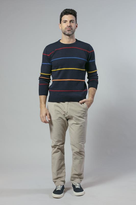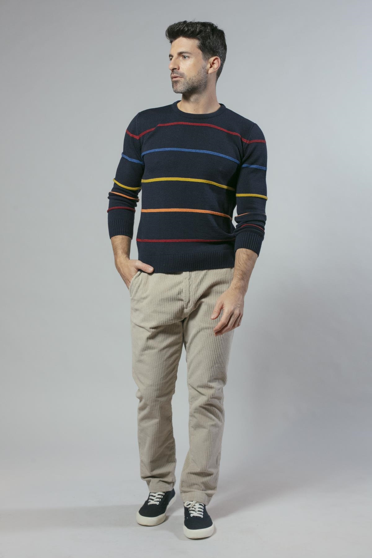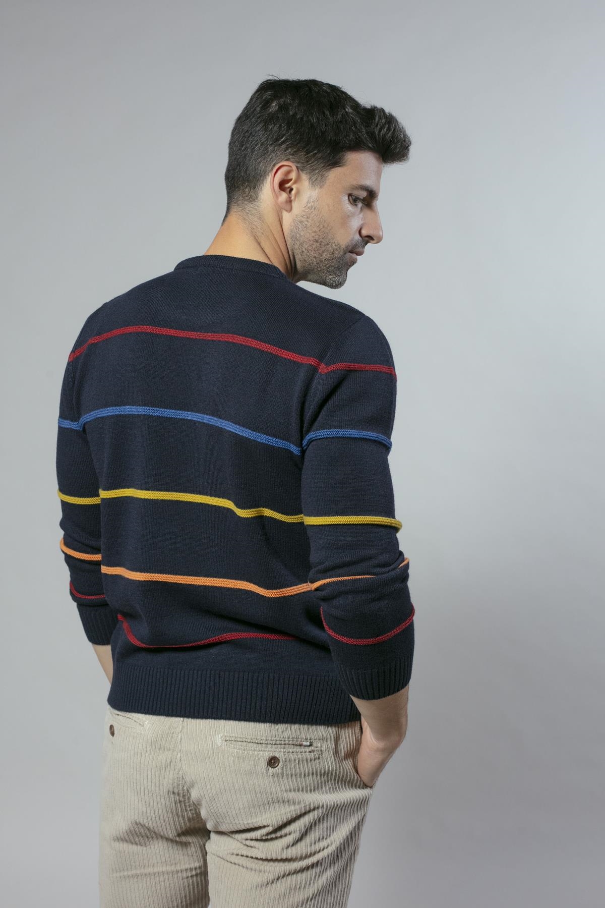 Jersey azul marino y rayas de varios colores, de corte ligeramente regular y cuello redondo en punto de mezcla de lana.