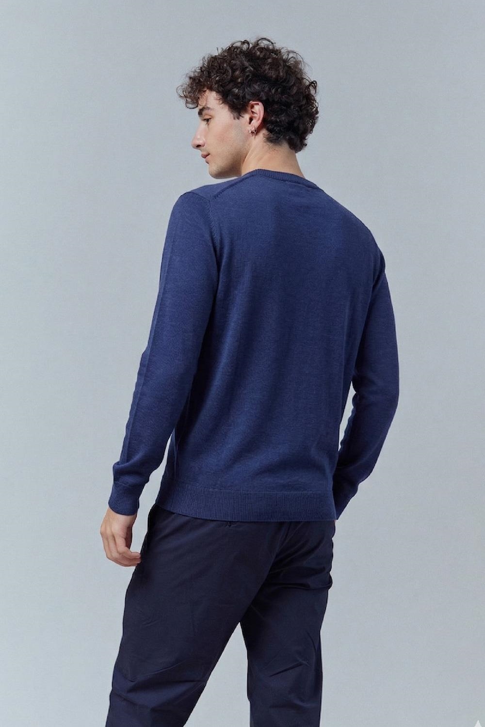 Jersey azul denim en algodón con costuras visibles en los hombros. Es de corte regular, manga larga con puño en canalé y contraste ficolor en el falso doble cuello.