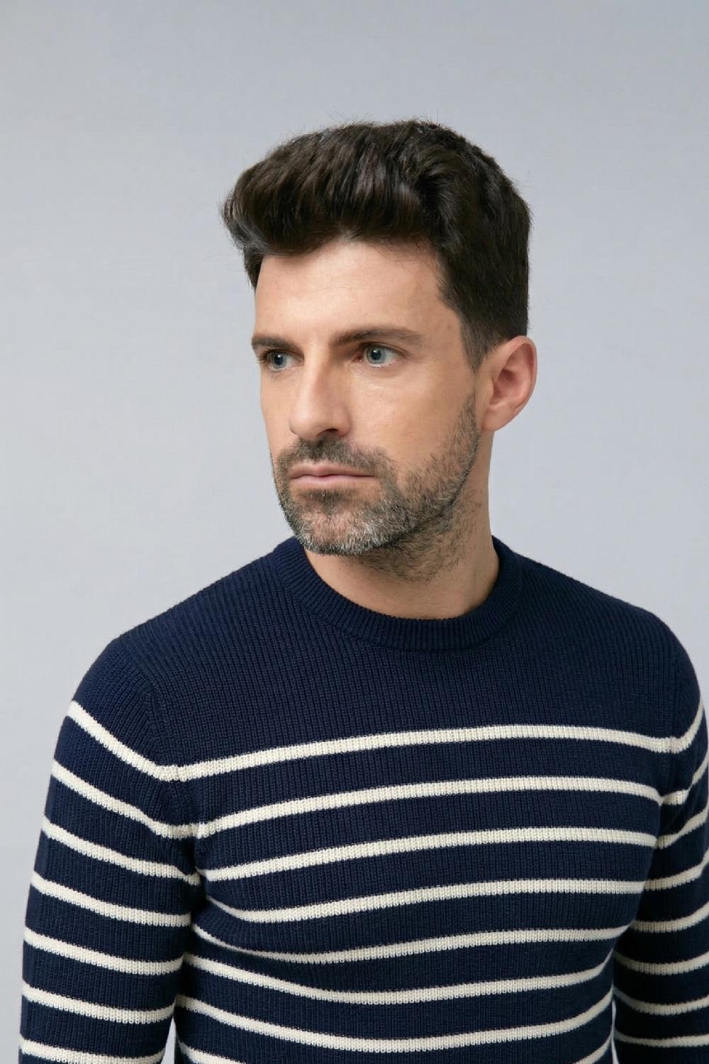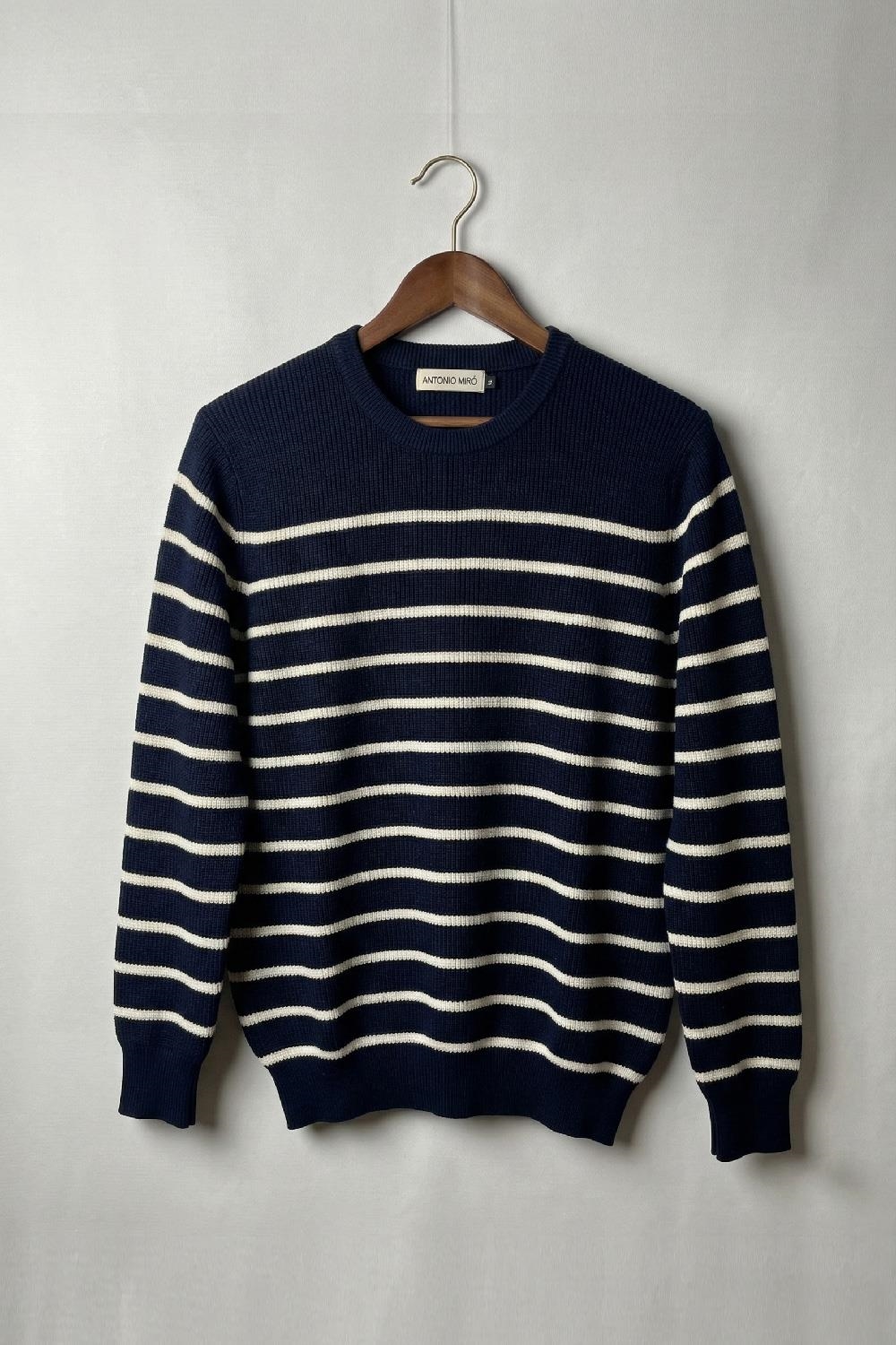 Jersey azul marino de rayas finas blancas de manga larga en algodón. De corte ajustado y cuello redondo en canalé también en mangas y bajo.