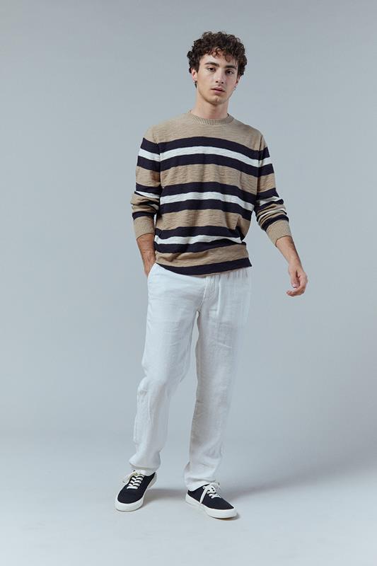 Jersey beige de rayas irregulares blancas y azules en algodón fino. Es de corte regular, cuello redondo y manga larga con puño en canalé.