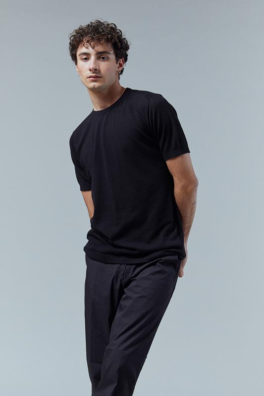 Jersey de manga corta en algodón muy fino, de corte ajustado y cuello redondo. Tiene unas aberturas laterales que le aportan una mayor comodidad. Disponible en negro y blanco roto.