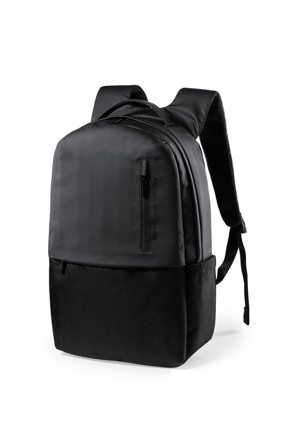 Mochila de Antonio Miró de calidad premium en resistente poliéster 600D de sobrio diseño en color negro. Con cierre de cremallera, bolsillo frontal y asa reforzada metálica. Con acolchado ergonómico en espalda y cintas de hombros, incluye compartimento interior acolchado para portátil de hasta 15 pulgadas y para tablets de hasta 10 pulgadas. Fundas interiores para bolígrafos y smartphone. Con logotipo de la marca en frontal. Acolchada. Bolsillo Acolchado para Portátil y Tablet Poliéster 600D.
