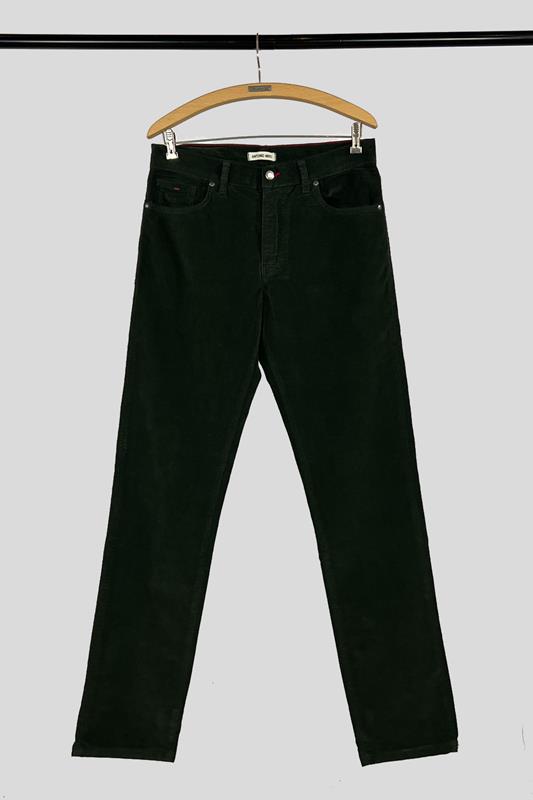 Pantalón cinco bolsillos de micropana en algodón, ligeramente elásticos y de corte regular. Disponible en verde y camel.