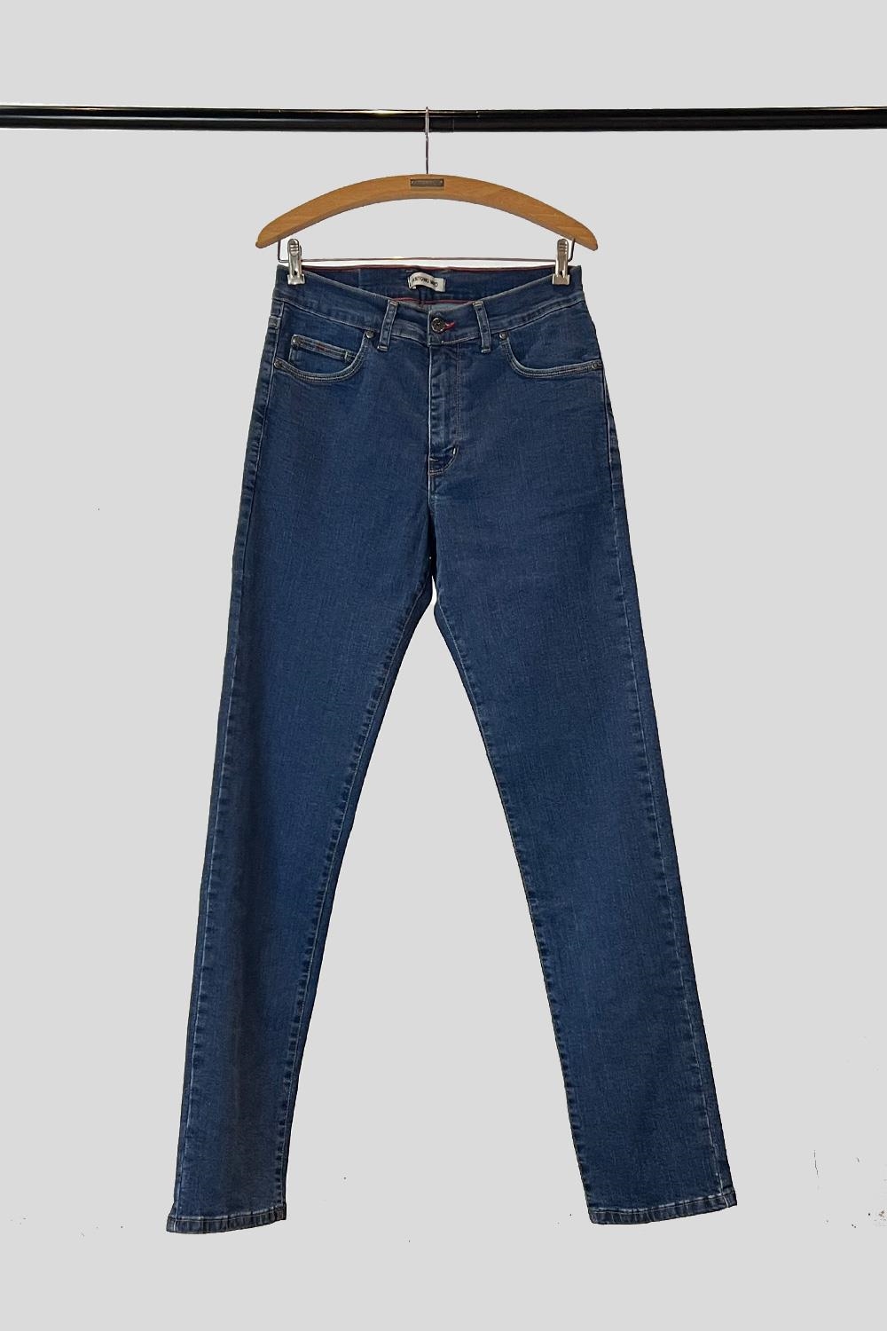 Pantalón tejano en algodón elástico y de corte regular. Disponible en azul denim y marino.