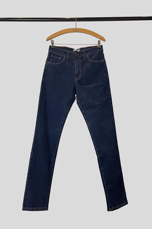 Pantalón tejano 5 bolsillos en algodón elástico y de corte regular. Disponible en azul marino y denim desgastado.
