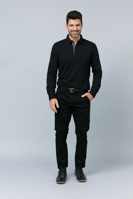 Pantalón chino en algodón elástico de corte slim. Disponible en negro y arcilla.
