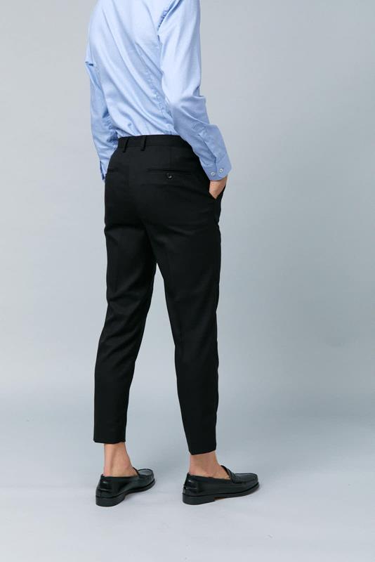 Pantalón de vestir tobillero en nylon de corte slim. Disponible en negro y azul marino.