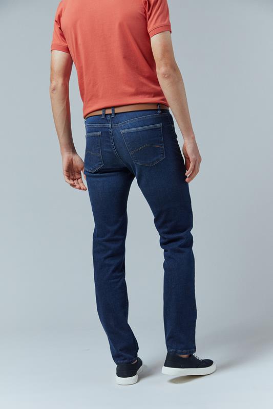 Pantalón vaquero azul ligeramente desgastado, en algodón elástico y de corte regular que por su composición resulta muy cómodo y favorecedor.