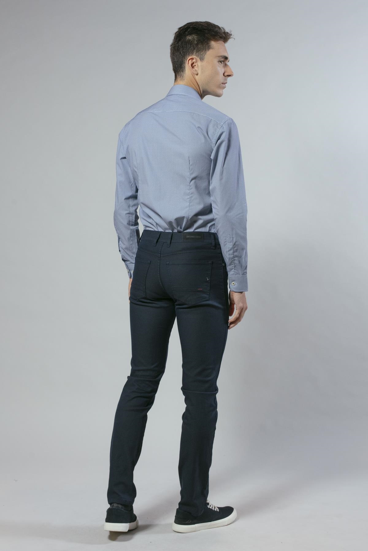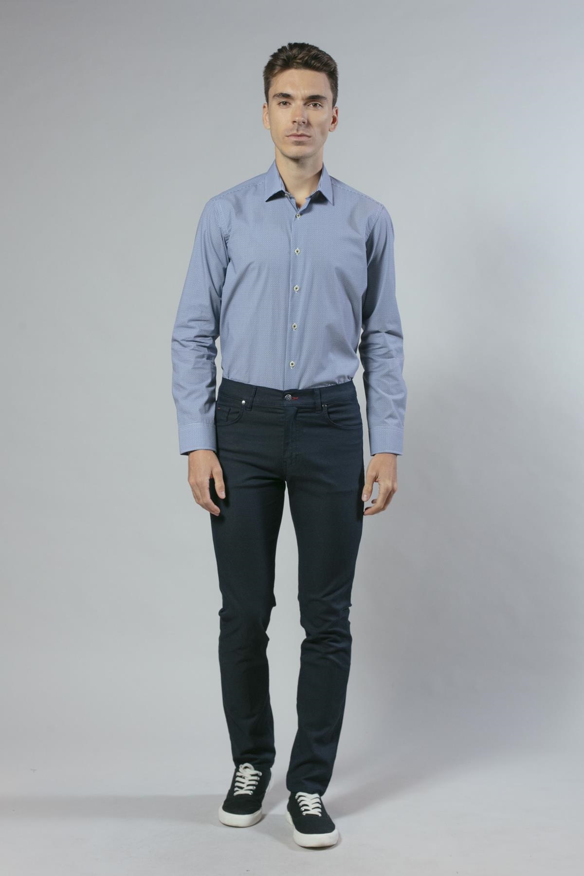 Pantalón 5 bolsillos en estructura de algodón ligeramente brillantes y de corte regular. Disponible en dos colores: azul marino y gris.