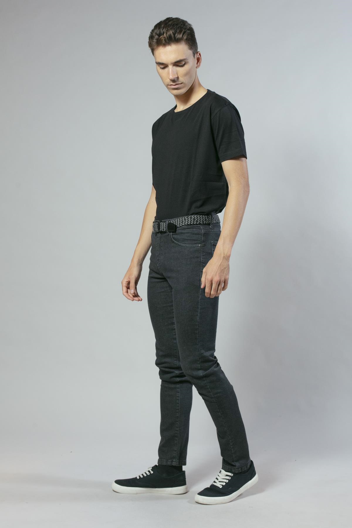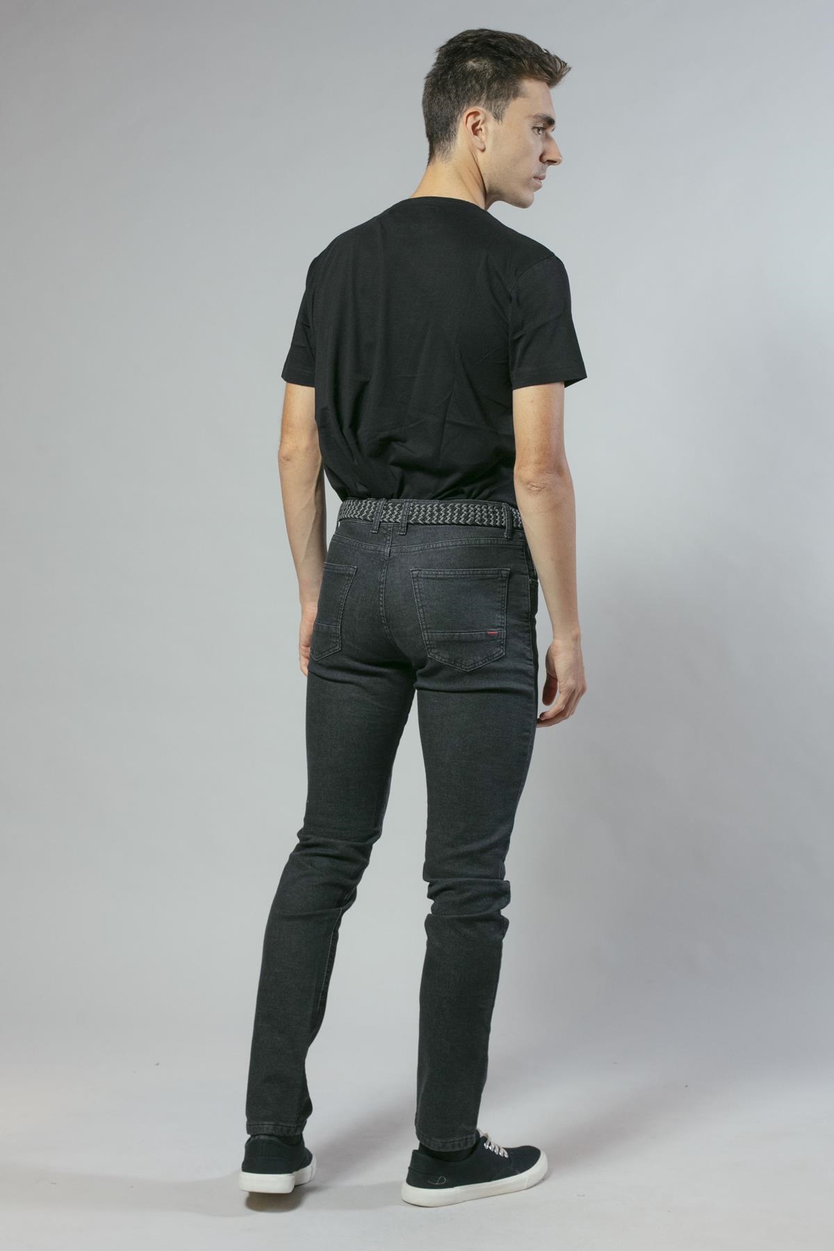 Pantalón tejano negro "stone washed" en algodón elástico, de corte regular con detalles en los bolsillos traseros.