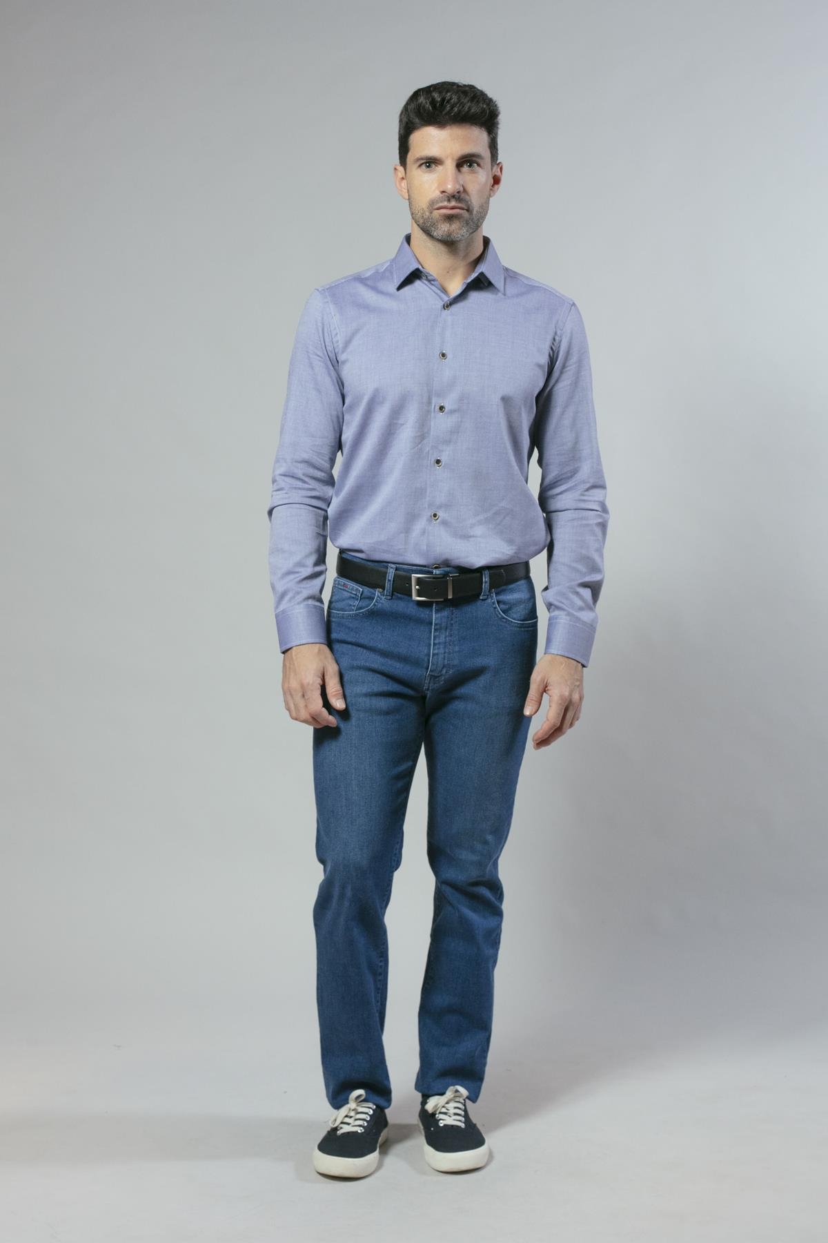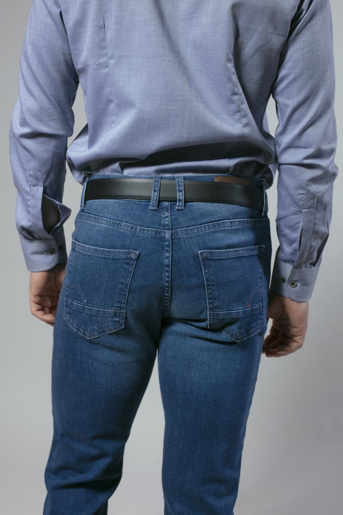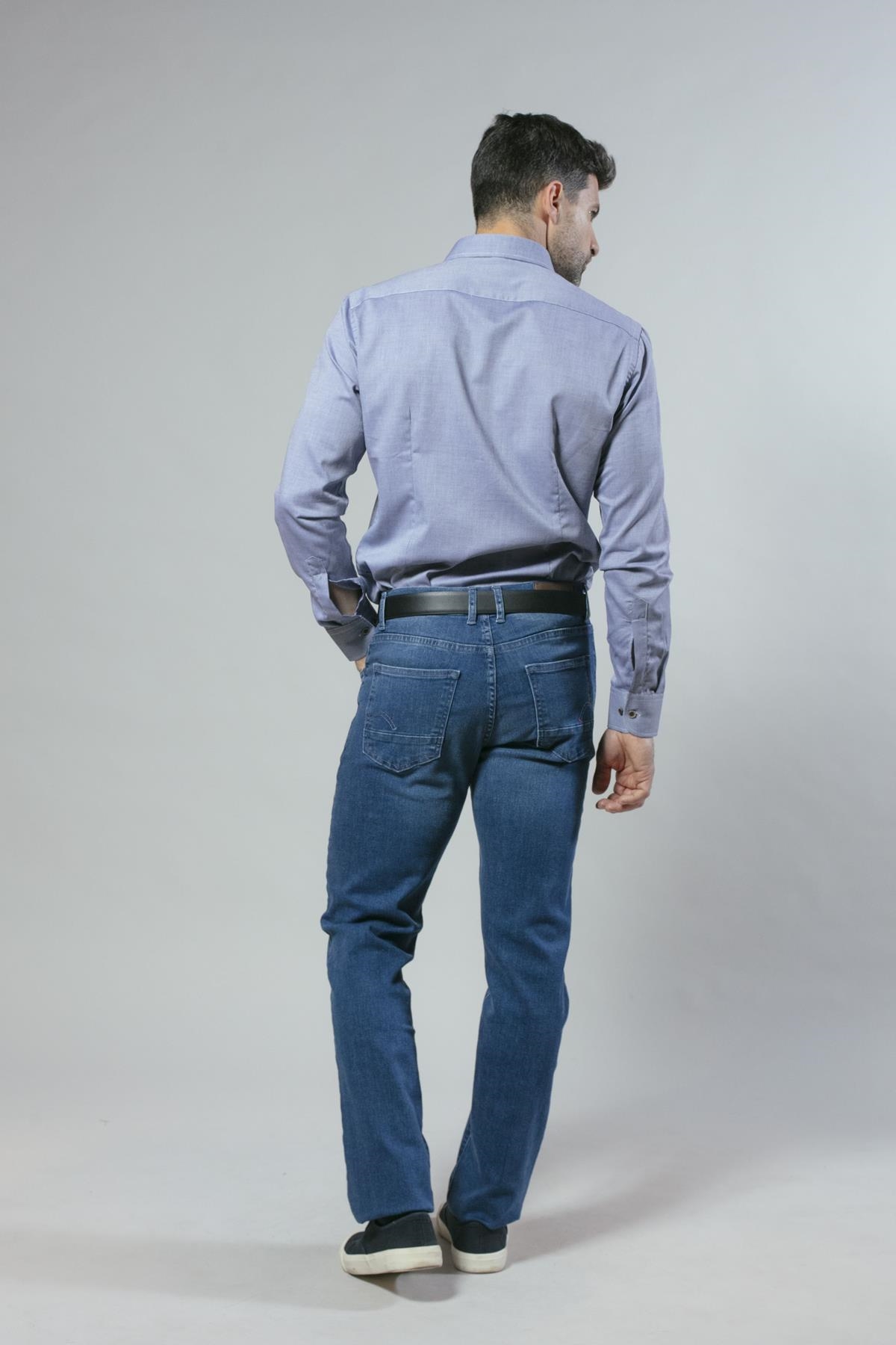 Pantalón tejano azul en algodón elástico, de corte regular con detalles en los bolsillos traseros.