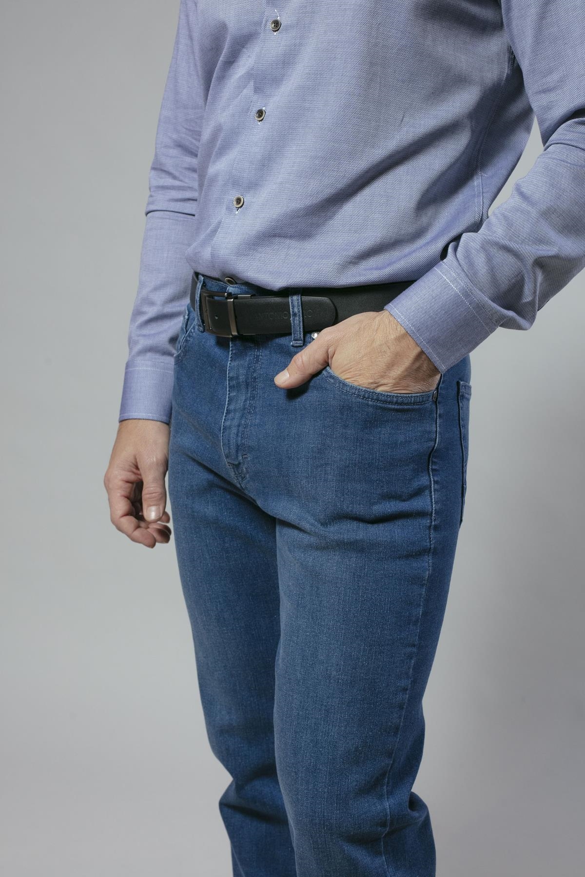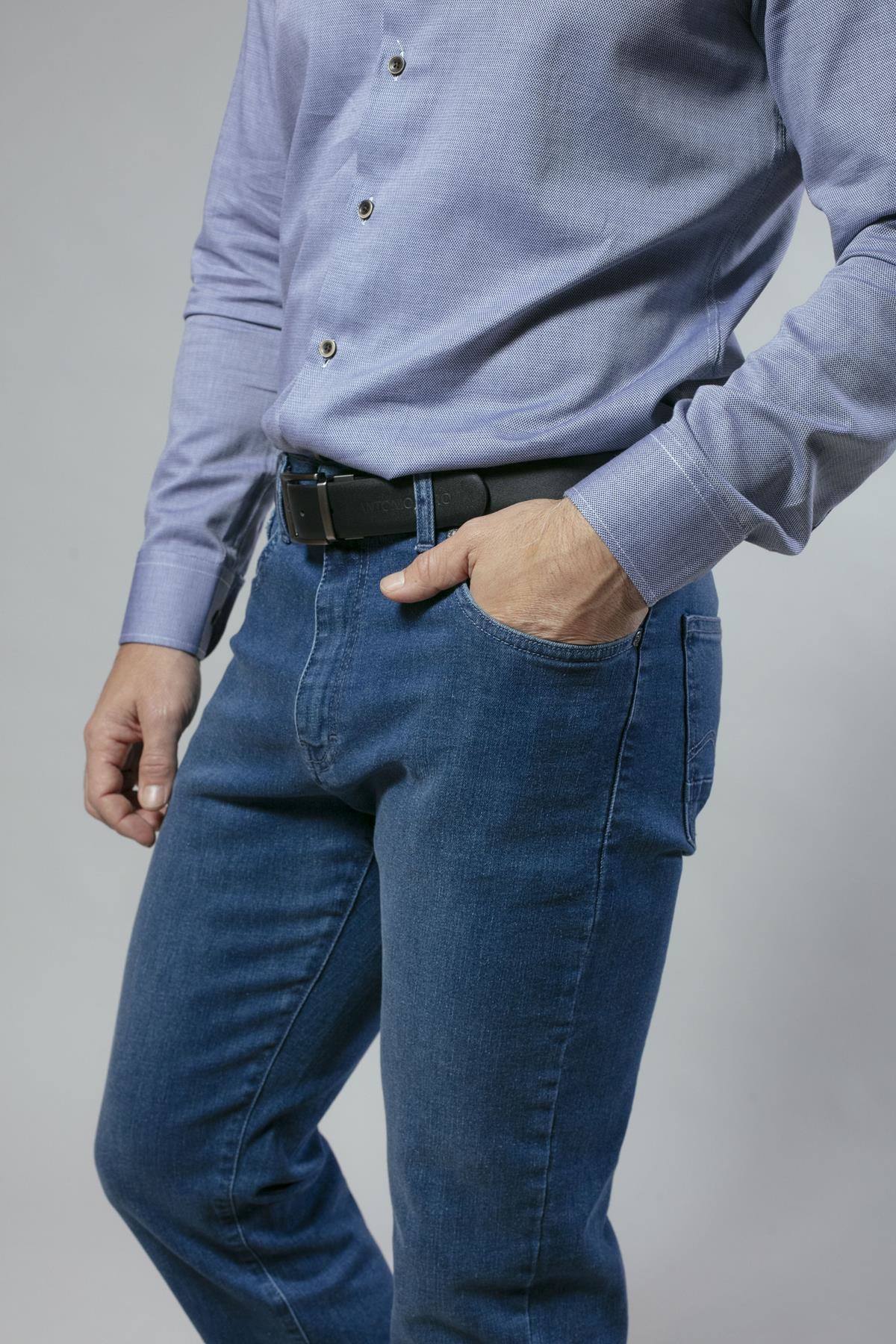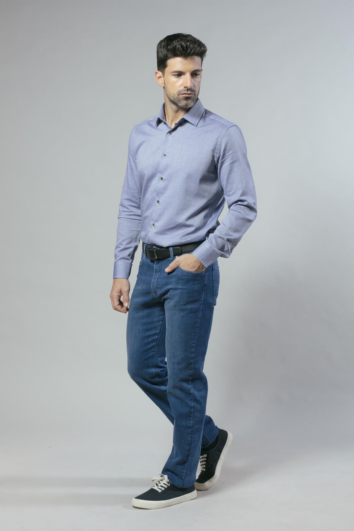 Pantalón tejano azul en algodón elástico, de corte regular con detalles en los bolsillos traseros.