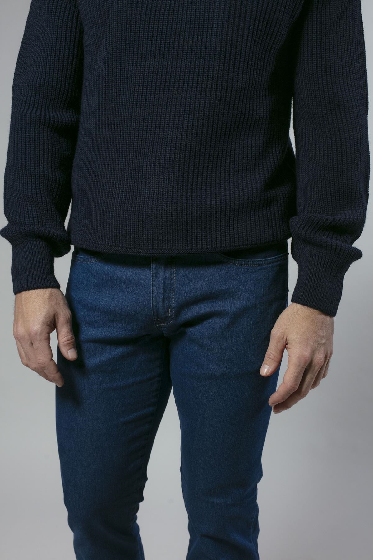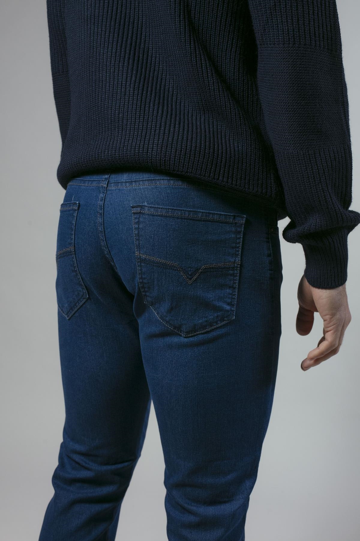 Pantalón tejano azul en algodón elástico, de corte regular con detalles en los bolsillos traseros.